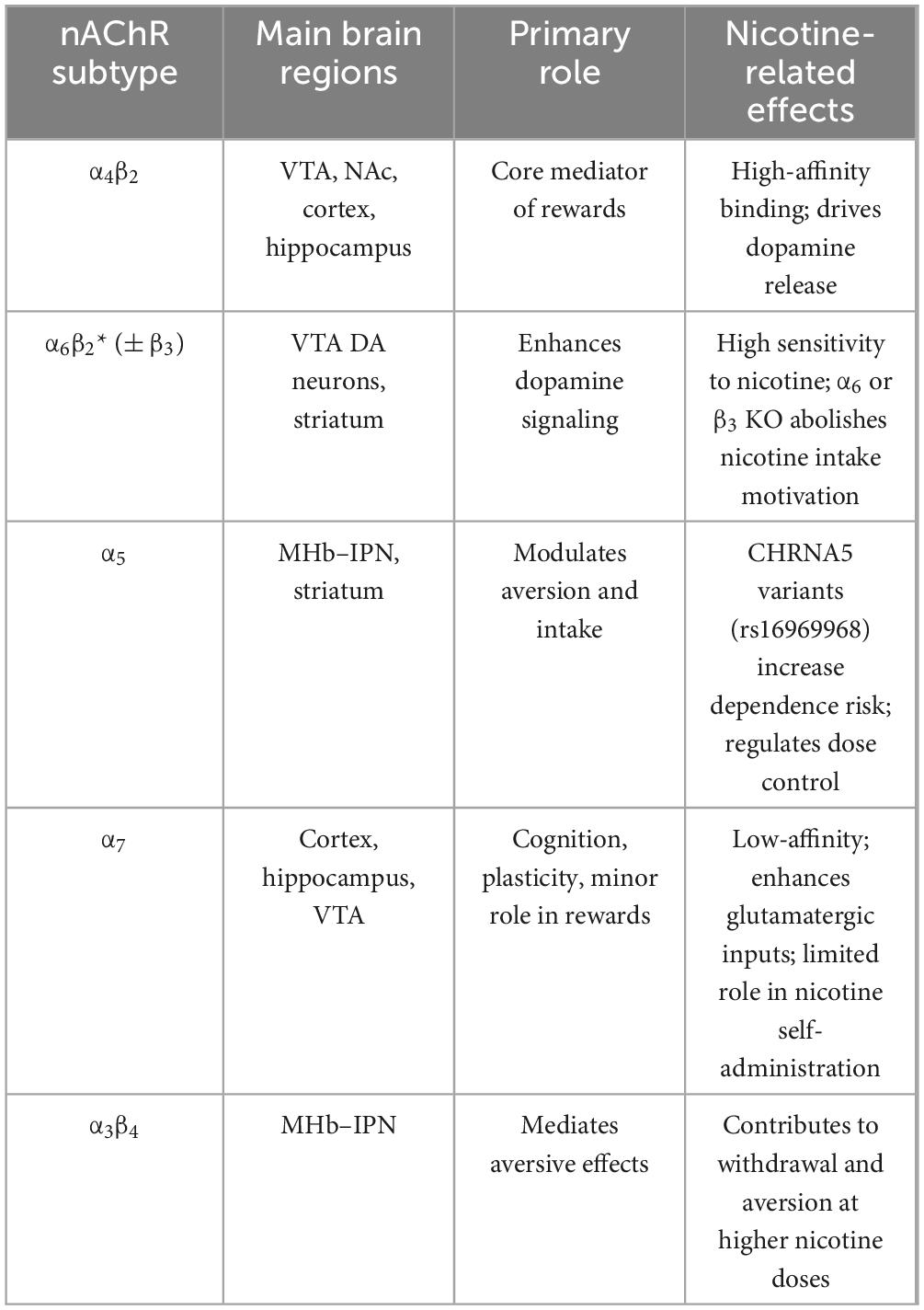 Table 1. Major nicotinic acetylcholine recepto (nAChR) subtypes and their roles in nicotine addiction.