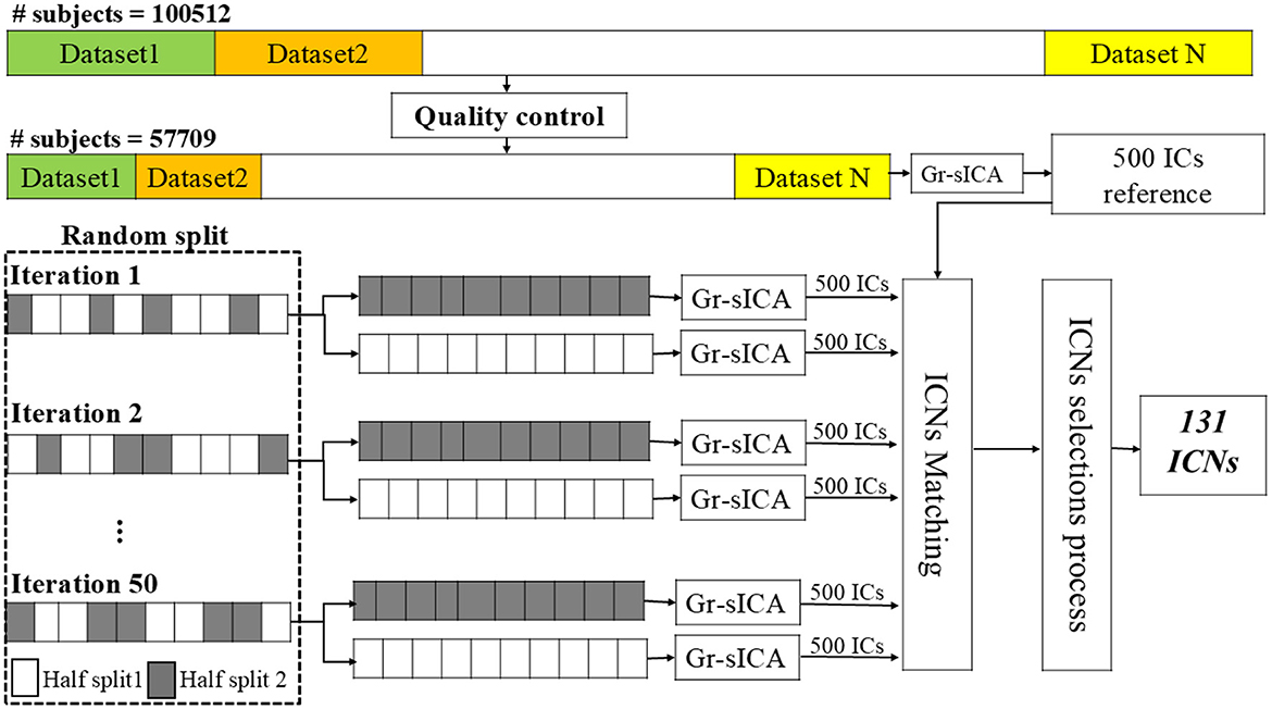 Figure 1. Analysis pipeline: Data from 100,512 subjects underwent preprocessing and quality control (QC), resulting in 57,709 subjects passing QC. Spatial Group-level Independent Component Analysis (sgr-ICA) was then applied to generate 500 independent components (ICs). The QC-passed dataset was randomly split into two halves, and sgr-ICA was applied to each half to independently generate 500 ICs. This process was repeated independently 50 times. Next, through component matching and selection, 131 stable and reliable ICs were identified and labeled as intrinsic connectivity networks (ICNs), forming the NeuroMark-500 template.