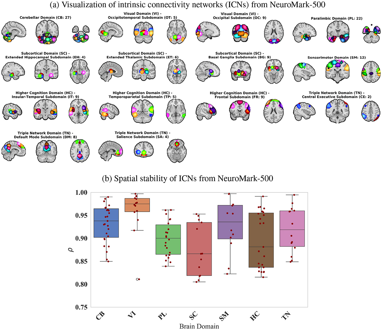 Figure 2. (a) Representation of 131 spatial maps of ICNs from NeuroMark-500 for each of the seven domains and 14 subdomains- labeling based on based on NeuroMark 2.2 template: cerebellar (CB), visual-occipitotemporal (VI-OT), visual-occipital (VI-OC), paralimbic (PL), subcortical extended hippocampal (SC-EH), subcortical-extended thalamic (SC-ET), subcortical-basal ganglia (SC-BG), sensorimotor (SM), higher cognition-insular temporal (TC-IT), higher cognition-temporoparietal (HC-TP), higher cognition-frontal (HC-FR), triple network-central executive (TN-CE), triple network-default mode (TN-DM), and triple network-salience (TN-SA). The spatial maps of ICs are thresholded with a z-score of 1.96 (p-value < 0.05). (b) Spatial stability of the 131 ICNs from NeuroMark-500, evaluated across 50 split-half iterations.