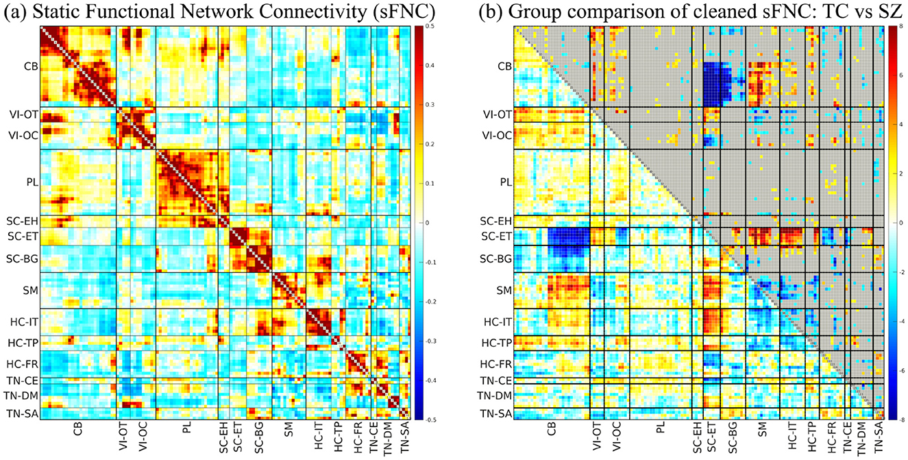 Figure 3. Clinical application results of ICNs from NeuroMark-500 for 1,142 subjects in the BSNIP dataset. (a) Heatmap of sFNC between ICNs, showing averaged pairwise correlations between time courses of different brain domains. (b) Group comparison of cleaned sFNC (TC vs. SZ) using NeuroMark-500: The lower triangle represents −log(p-value) × sign(t-value), while the upper triangle highlights connectivity with p-values < 0.05. P-values are FDR corrected. Blue indicates hypoconnectivity in the SZ, while red represents hyperconnectivity in the SZ. Labels: cerebellar (CB), visual-occipitotemporal (VI-OT), visual-occipital (VI-OC), paralimbic (PL), subcortical extended hippocampal (SC-EH), subcortical-extended thalamic (SC-ET), subcortical-basal ganglia (SC-BG), sensorimotor (SM), higher cognition-insular temporal (HC-IT), higher cognition-temporoparietal (HC-TP), higher cognition-frontal (HC-FR), triple network-central executive (TN-CE), triple network-default mode (TN-DM), and triple network-salience (TN-SA).