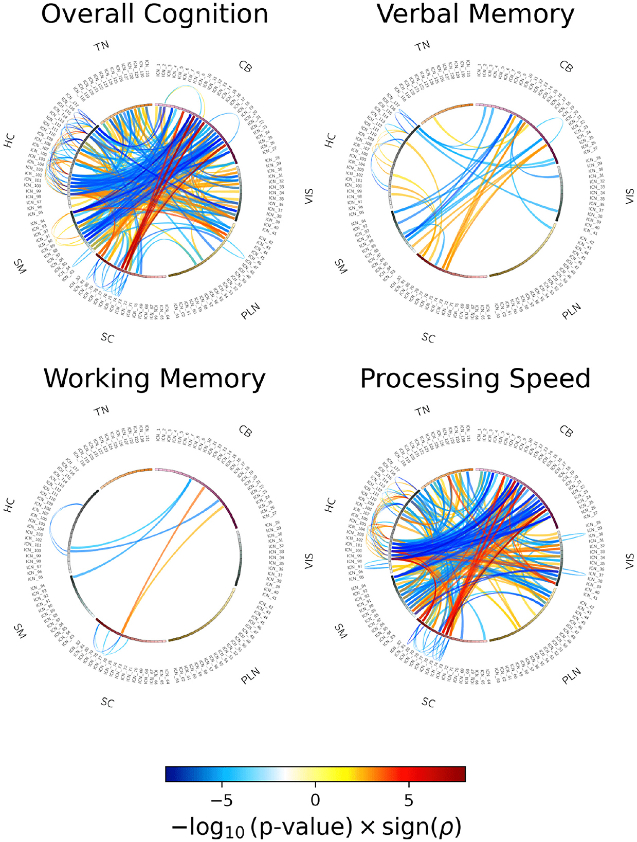 Figure 4. Associations between cognitive scores and cleaned sFNC from NeuroMark-500. The connectograms highlight Pearson correlation coefficients between cleaned sFNC and cognitive measures including overall cognition, verbal memory, working memory, and processing speed—showing significant correlations (p < 0.005). p-values are FDR corrected.