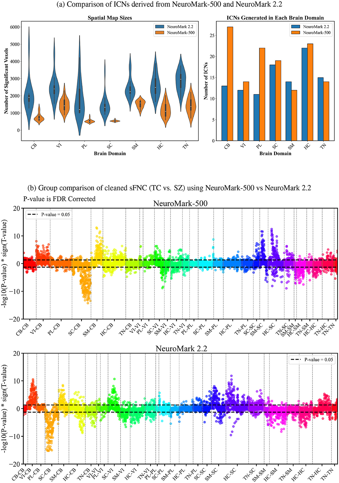 Figure 5. Comparison of ICNs derived from NeuroMark-500 and NeuroMark 2.2. (a) Spatial map sizes and ICNs distribution across brain domains. (b) Group comparison of sFNC (TC vs. SZ) using NeuroMark-500 vs. NeuroMark 2.2: Positive side indicates hypoconnectivity in the SZ, while negative side represents hyperconnectivity in the SZ.