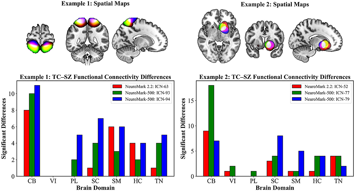 Figure 6 presents two representative examples highlighting the capability of NeuroMark-500 to capture finer-grained brain networks and provide more detailed insights into the functional patterns of the SZ group, compared to the larger scale ICNs used in NeuroMark 2.2. In each example, we selected one ICN from NeuroMark 2.2 and identified its correspondence into two distinct ICNs from NeuroMark-500 using Pearson correlation of spatial maps.