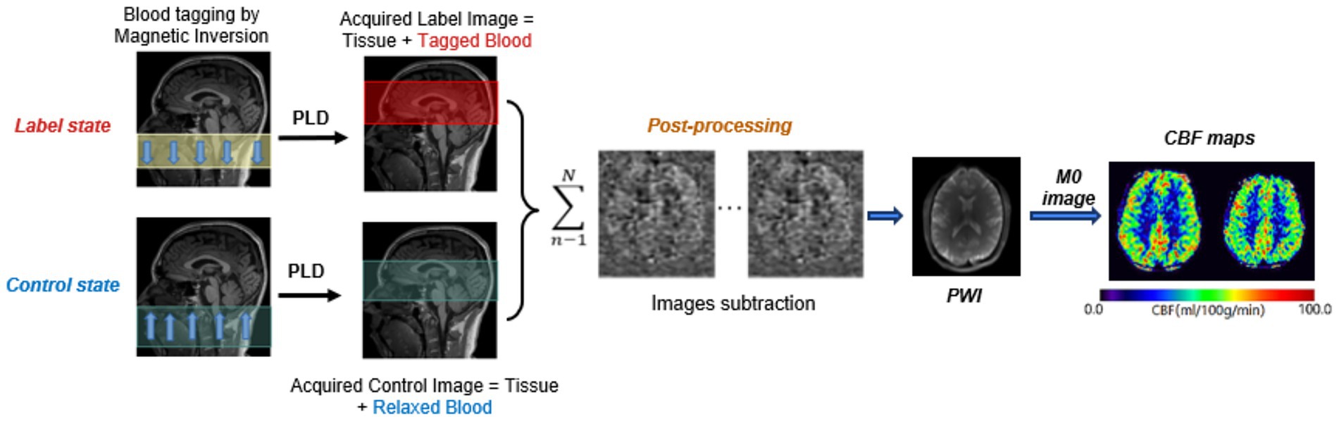 ASL is a non-invasive MRI technique that measures cerebral perfusion using magnetically labeled arterial blood water as an endogenous tracer (Kwong et al., 1995). Labeling is achieved by applying a radiofrequency (RF) pulse upstream from the imaging volume, which inverts the magnetization of inflowing arterial blood. After a post-labeling delay (PLD), the labeled blood reaches the brain tissue and exchanges with tissue water, generating a signal change proportional to CBF (Figure 1; Williams et al., 1992). The standard ASL acquisition alternates between two conditions: Label image: arterial blood is inverted, leading to reduced tissue signal. Control image: no inversion is applied, serving as a baseline. By subtracting the label from the control image, a perfusion-weighted image (PWI) is obtained, isolating the signal difference related to tissue perfusion (Noguchi et al., 2008; Suzuki et al., 2024). This subtraction method reduces static tissue contributions, enhancing sensitivity to flow-related changes.