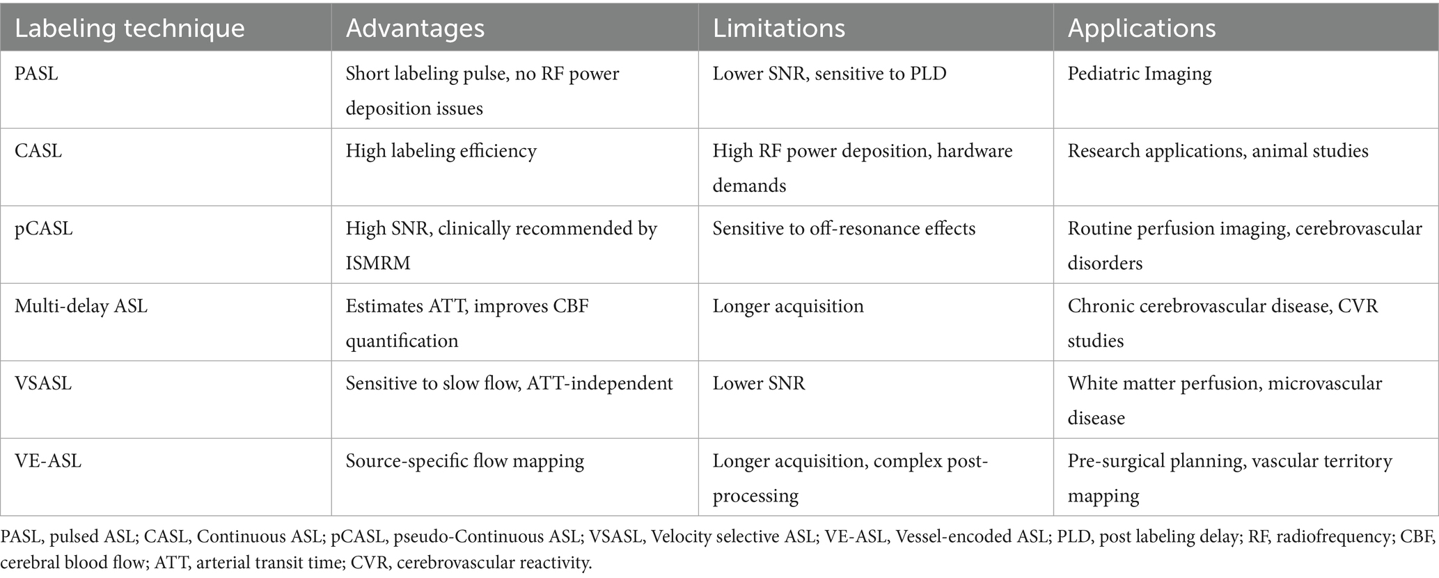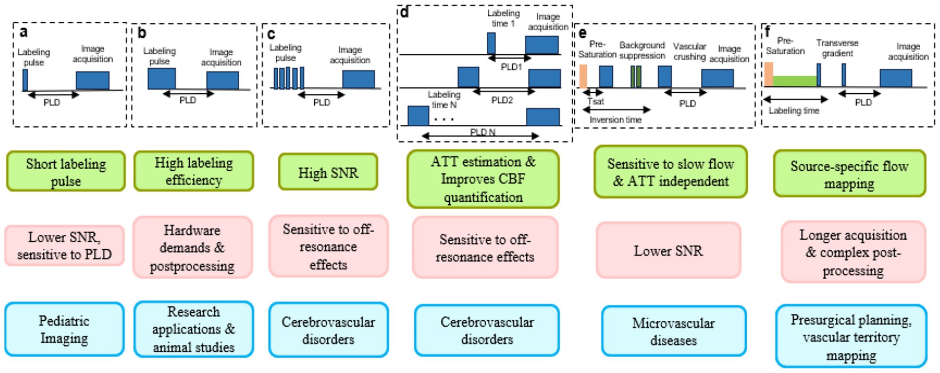 Several ASL techniques exist, differing in labeling strategy, sequence design, and sensitivity to physiological conditions (Figure 2; Table 1):