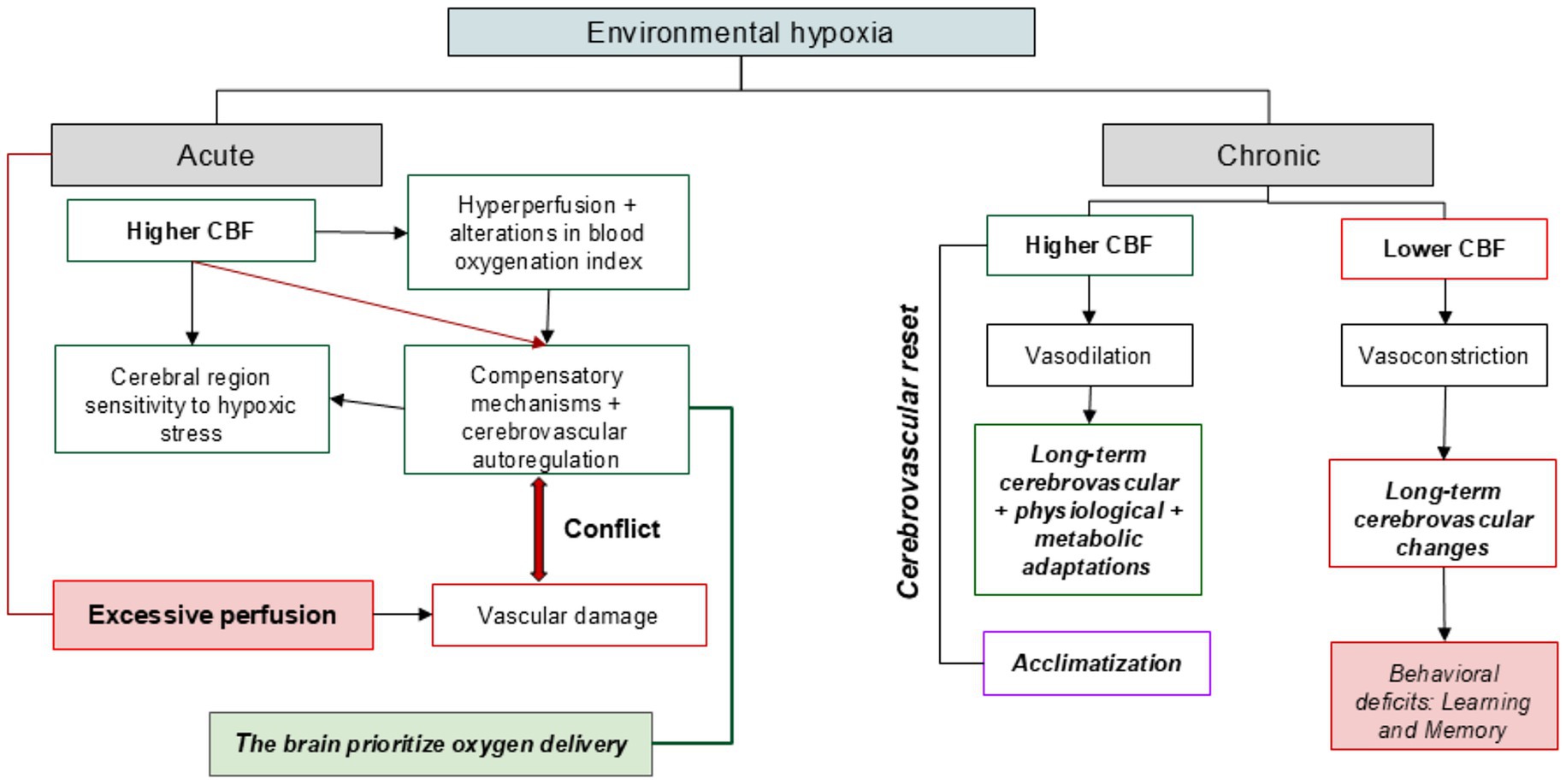 Figure 3. The brain’s vascular responses to environmental hypoxia under acute and chronic conditions. The color coding highlights the nature of each physiological process: Green: Positive adaptive responses or compensatory mechanisms that support cerebral oxygen delivery or neurovascular regulation (e.g., increased CBF, autoregulation). Red: Maladaptive responses or negative outcomes (e.g., excessive perfusion, vascular damage, behavioral deficits). Blue: Long-term adaptive changes involving cerebrovascular, physiological, and metabolic adjustments under chronic hypoxia. Purple: Acclimatization processes reflecting a specific type of long-term adaptation to hypoxic environments.