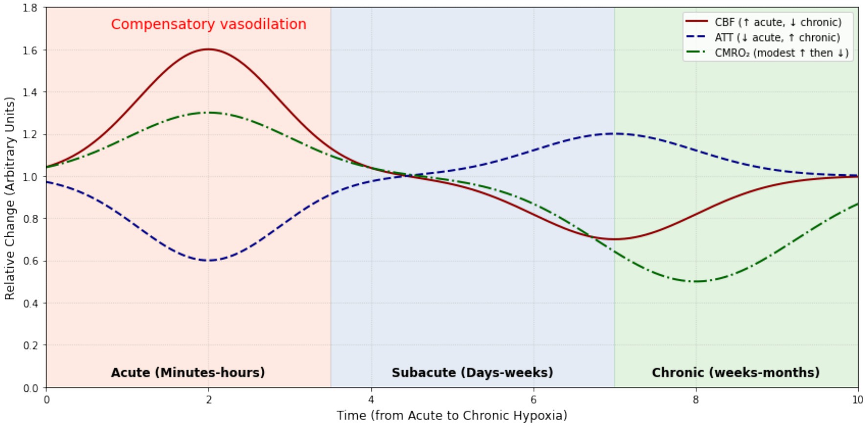 Chronic exposure to environmental hypoxia, such as that experienced by high-altitude residents or through repeated hypoxic training such as in freediving (Micaux et al., 2025), induces long-term cerebrovascular adaptations that involve both vascular remodeling and metabolic reprogramming. Among the most consistently observed phenomena is the modulation of CBF and ATT, together providing a window into the evolving cerebrovascular status of the brain under sustained hypoxic stress.