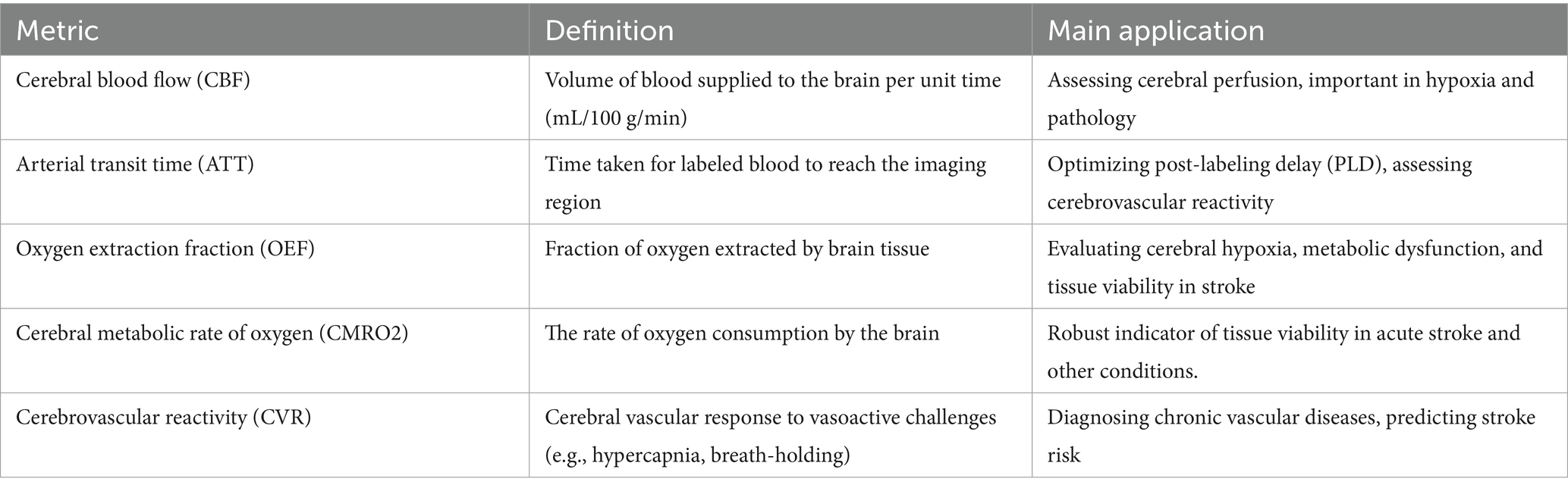 • The potential of ASL-derived parameters (CBF, ATT, CVR, and CMRO2) as biomarkers of cerebrovascular dysfunction;