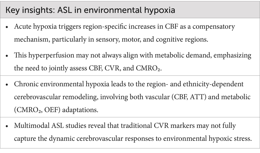 Taken together, these studies underscore the necessity of a dynamic, integrative framework, considering CBF, CVR, and CMRO₂, to understand environmental acute cerebrovascular responses to hypoxia. Such an approach provides a more physiologically grounded interpretation of ASL data and supports the development of robust biomarkers for monitoring cerebral resilience and vulnerability under environmental stress.