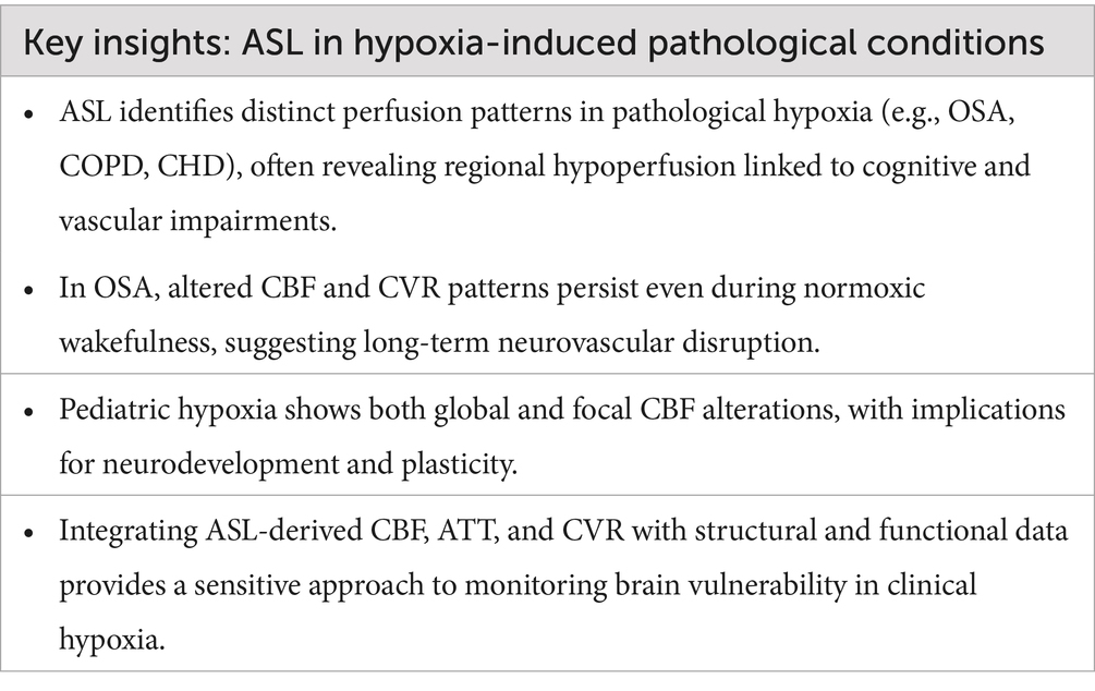 Originally developed for neurovascular and oncological applications such as neurodegeneration and tumor imaging (Noguchi et al., 2008; Troudi et al., 2023; Troudi et al., 2022), dementia (Grade et al., 2015), ASL has gained traction in conditions involving altered oxygen availability. In obstructive sleep apnea (OSA; Harris et al., 2013), chronic mountain sickness (Ainslie and Subudhi, 2014), and high-altitude adaptation, ASL studies consistently report perfusion changes in regions governing autonomic regulation, memory, and executive function. These findings support the idea that hypoxia induces region-specific cerebrovascular alterations that may precede overt structural damage. Furthermore, metrics such as prolonged ATT or reduced CVR have been linked to impaired vascular reserve and cognitive vulnerability in aging and small vessel disease (Dai et al., 2017; Neumann et al., 2022), underscoring clinically relevant biomarkers for hypoxia-induced neurovascular dysfunction.