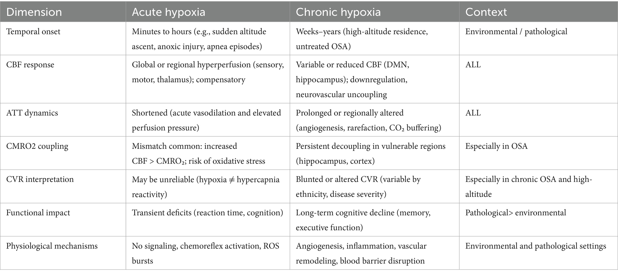 Table 3. Summary of cerebrovascular patterns in acute vs. chronic hypoxia across environmental and pathological contexts.