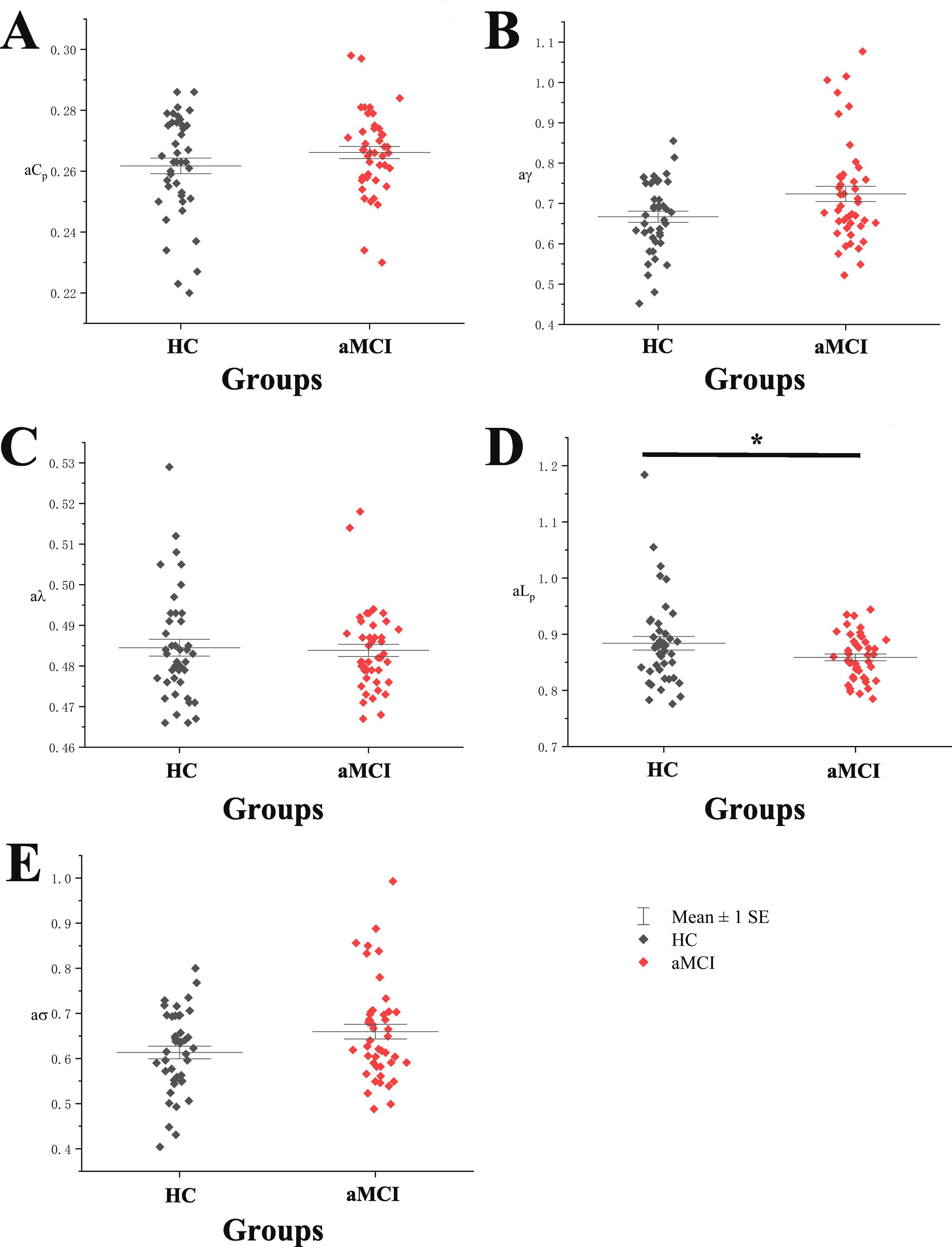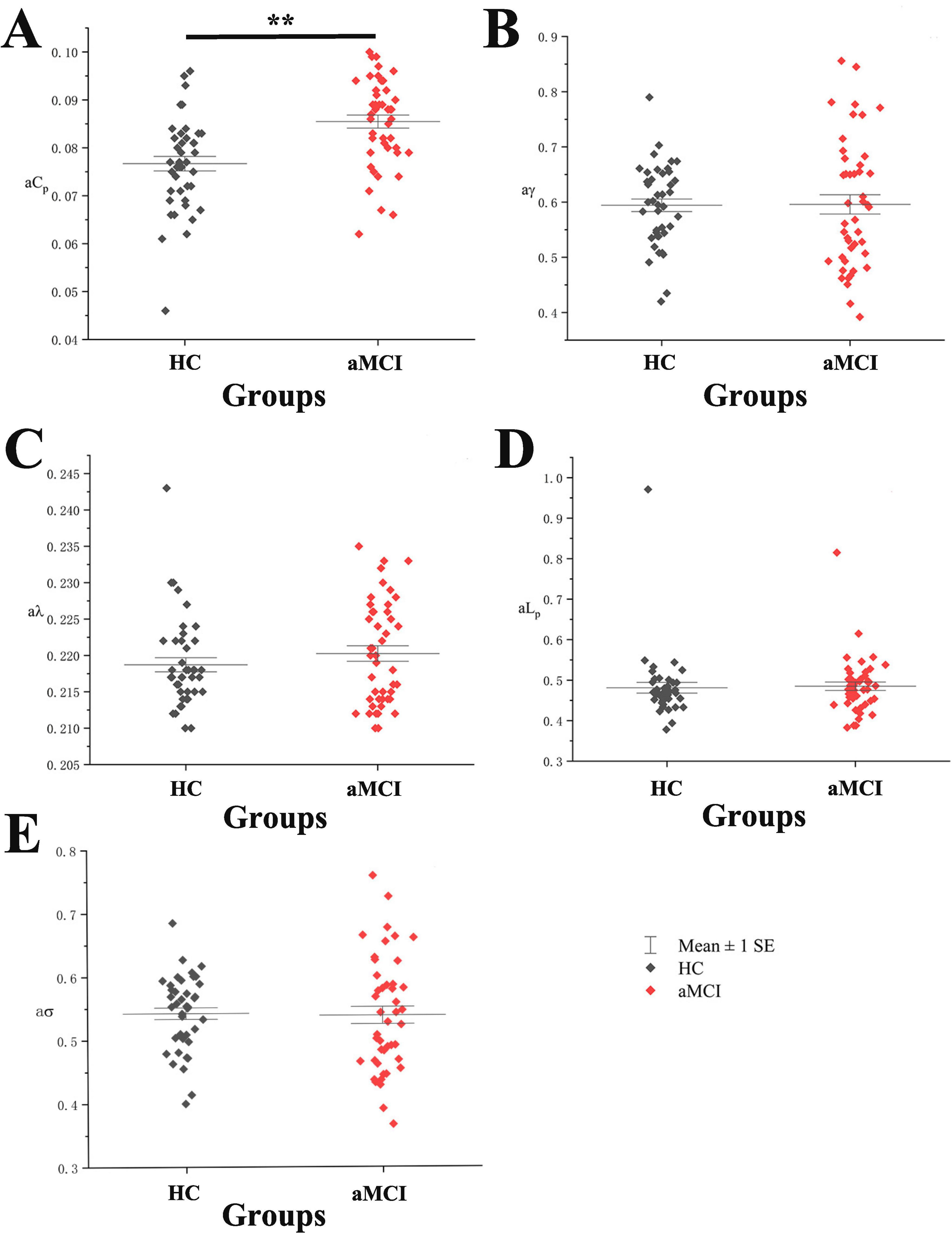 Statistical analysis of the total AUC for small-world property indices (aCp, aγ, aλ, aLp, aσ) in HC and aMCI groups revealed significant differences in aLp between aMCI and HC groups (P < 0.05), with no significant differences in other indices. See Figure 4.