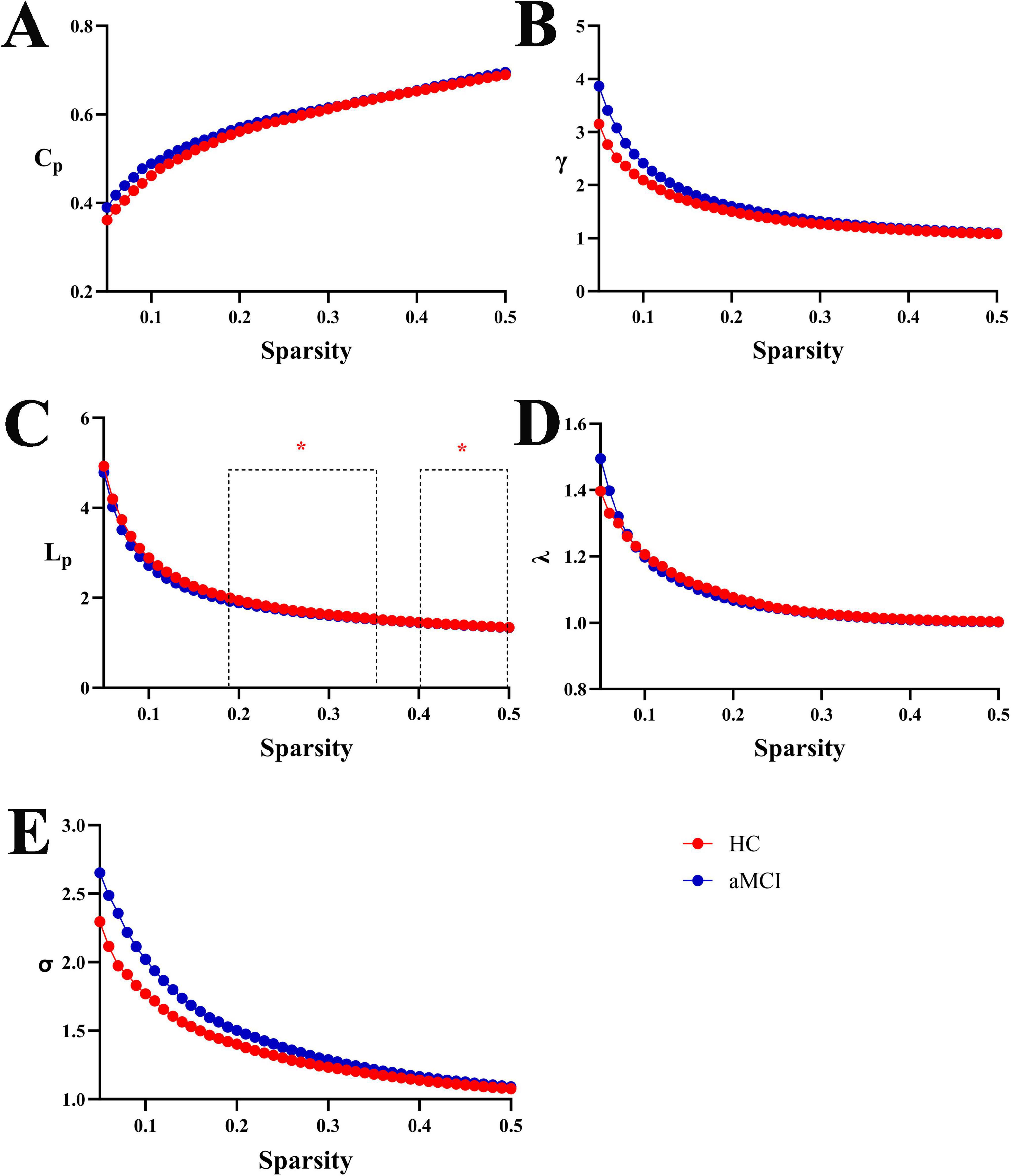 Figure 3. Trend graphs of small-world property indices in functional networks of HC and aMCI groups across sparsity thresholds of 0.05–0.5. (A) Line graph comparing Cp values between groups across sparsity; (B) line graph comparing Gamma (γ) values between groups across sparsity; (C) line graph comparing Lp values between groups across sparsity; (D) line graph comparing Lambda (λ) values between groups across sparsity; (E) line graph comparing Sigma (σ) values between groups across sparsity. *Indicating statistical significance, P < 0.05 (independent-samples t-test).