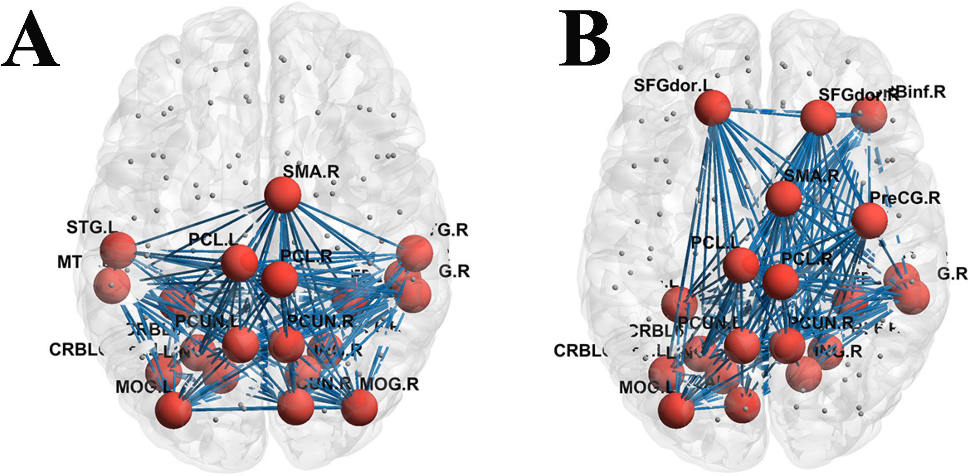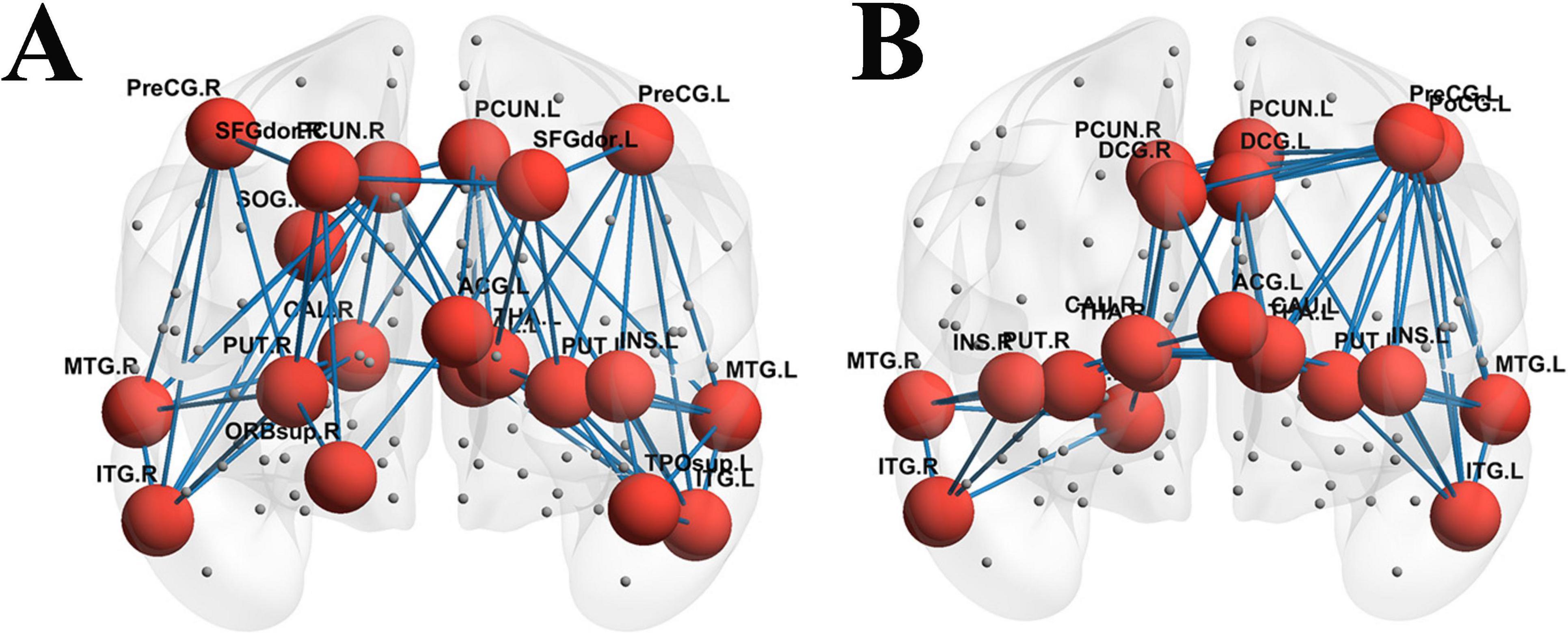 Figure 7. Functional network Rich-club organization. (A) Rich-club connections in the HC group; (B) Rich-club connections in the aMCI group; red spheres represent Rich-club nodes; gray spheres represent edge nodes (non-Rich-club nodes).