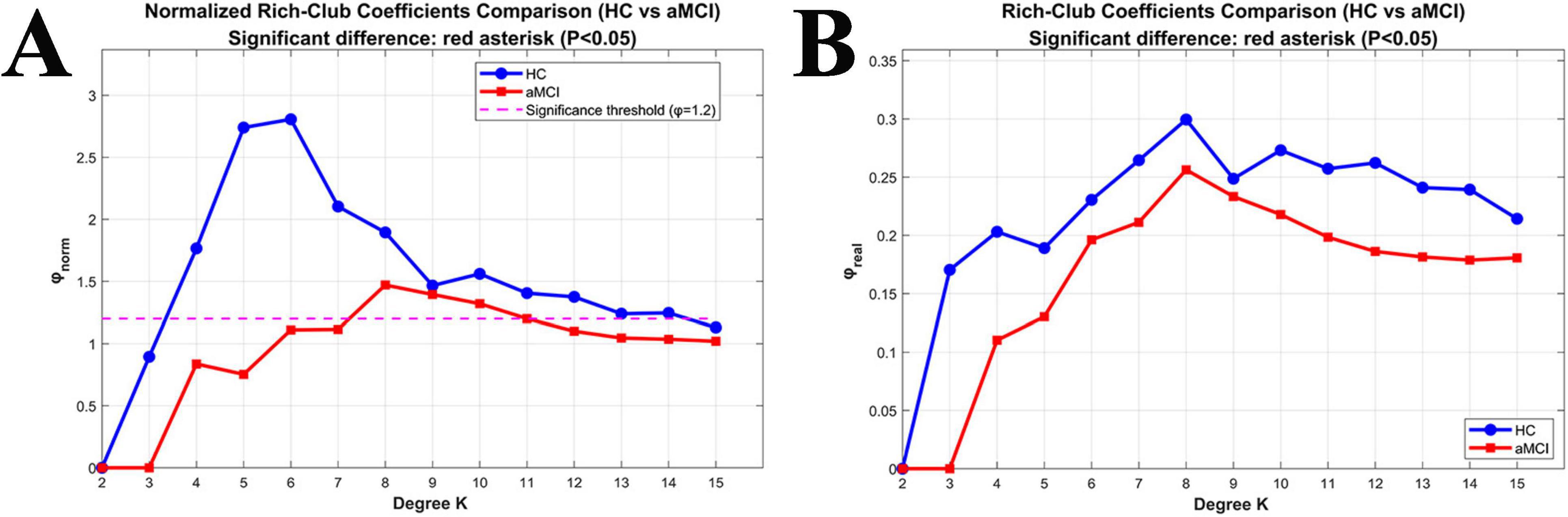 In the functional network study, the HC group showed a stable Rich-club phenomenon when K was 2-15, while the aMCI group only exhibited this phenomenon when K was 3-15, with a higher starting degree than the HC group. This reveals an abnormal topological threshold also exists in the functional Rich-club organization pattern of aMCI patients. Since functional networks rely on neural activity synchronization rather than physical structural connections, the aMCI group can still form the Rich-club at a relatively low K (i.e., K = 3), though the threshold is higher than that of the HC group (K = 2). This reflects an elevated activity screening threshold for functional core nodes, where a relatively higher number of connections is required to compensate for insufficient functional coupling caused by structural damage. Notably, within a specific degree range, the normalized Rich-club coefficient of the aMCI group was higher than that of the HC group, manifesting as tighter functional connections between high-degree nodes. This essentially represents the functional network compensating for the difficulty in Rich-club formation (caused by elevated topological thresholds) by enhancing the connection synchronization strength of core nodes. However, this compensation may exacerbate the local “information silo” effect, leading to reduced global integration efficiency. These findings reveal abnormal Rich-club organizational patterns in aMCI brain networks, though the underlying neural mechanisms require further exploration. Preliminary speculation suggests that nodal redistribution may relate to neurodegeneration and atrophy in specific brain regions, altering their network importance. Noteworthy limitations include a small sample size and lack of longitudinal tracking. Future studies could expand sample scales, integrate long-term follow-up data, and clarify the dynamic relationship between Rich-club changes and aMCI progression to inform precision intervention strategies.
