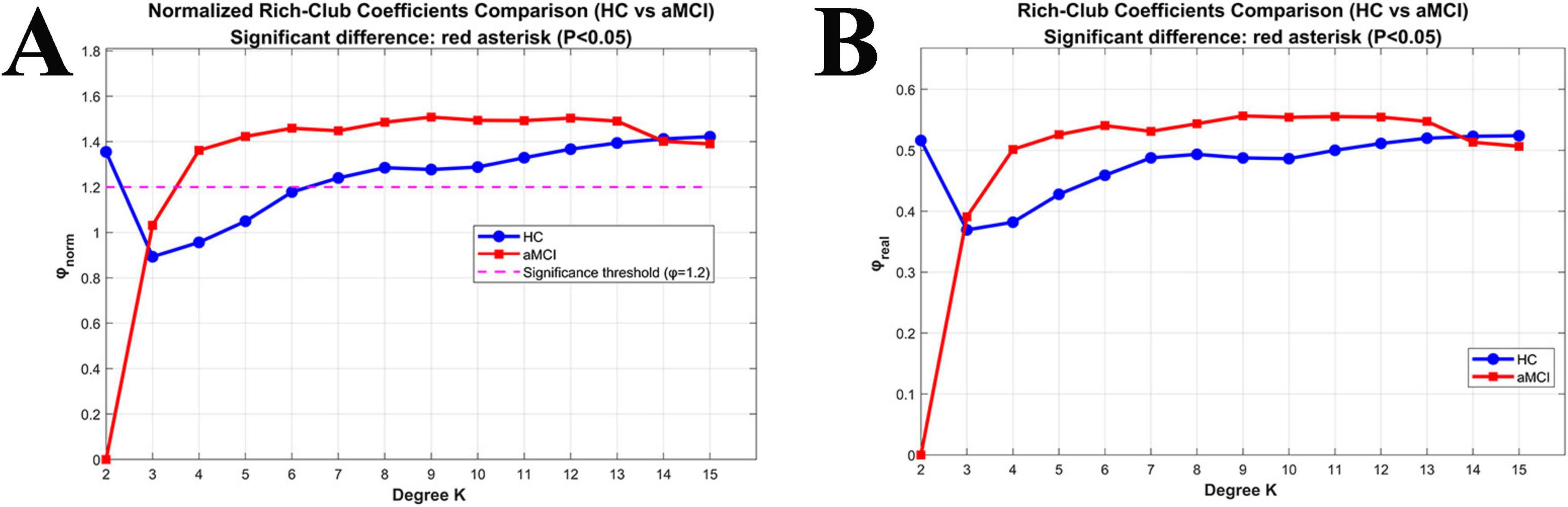 Figure 8. Relationships between Rich-club coefficients and degree (K) in functional networks. (A) Changes in normalized Rich-club coefficients (φnorm) with K between the two groups; (B) changes in real Rich-club coefficients (φreal) with K between the two groups.
