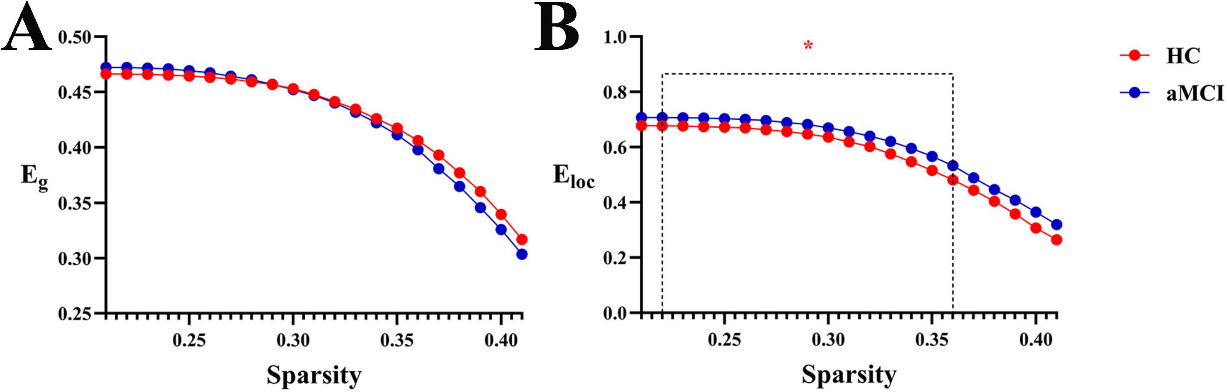 In this study, we compared brain network efficiency between aMCI patients and HC groups. The results showed that compared with the HC group, the Eloc of the WM structural network in aMCI patients was significantly higher, and the Eloc curve of the aMCI group was higher than that of the HC group across the entire sparsity range. There are two explanations for this phenomenon: first, pathological reorganization—due to damage to major long-range white matter fiber tracts, the brain network is divided into multiple relatively independent and overly dense local modules. Connections within the modules are relatively preserved or even strengthened, resulting in a forced isolated state at the cost of global communication. Second, compensatory response—to cope with early damage, the brain attempts to compensate for the deficiency in global network efficiency by enhancing the internal efficiency of local regions. In addition, the results revealed that when the network was streamlined to retain only the core connections, the Eg of the aMCI group was lower than that of the HC group under high sparsity. This indicates that substantial damage has occurred to the most critical core Rich-club connections in the structural network of aMCI patients, which is perfectly consistent with the previously observed result of reduced Rich-club coefficient in the aMCI structural network. At low sparsity, the abundant short- and medium-range connections may partially mask or compensate for the damage to core connections, leading to no significant difference in Eg between the aMCI and HC groups.