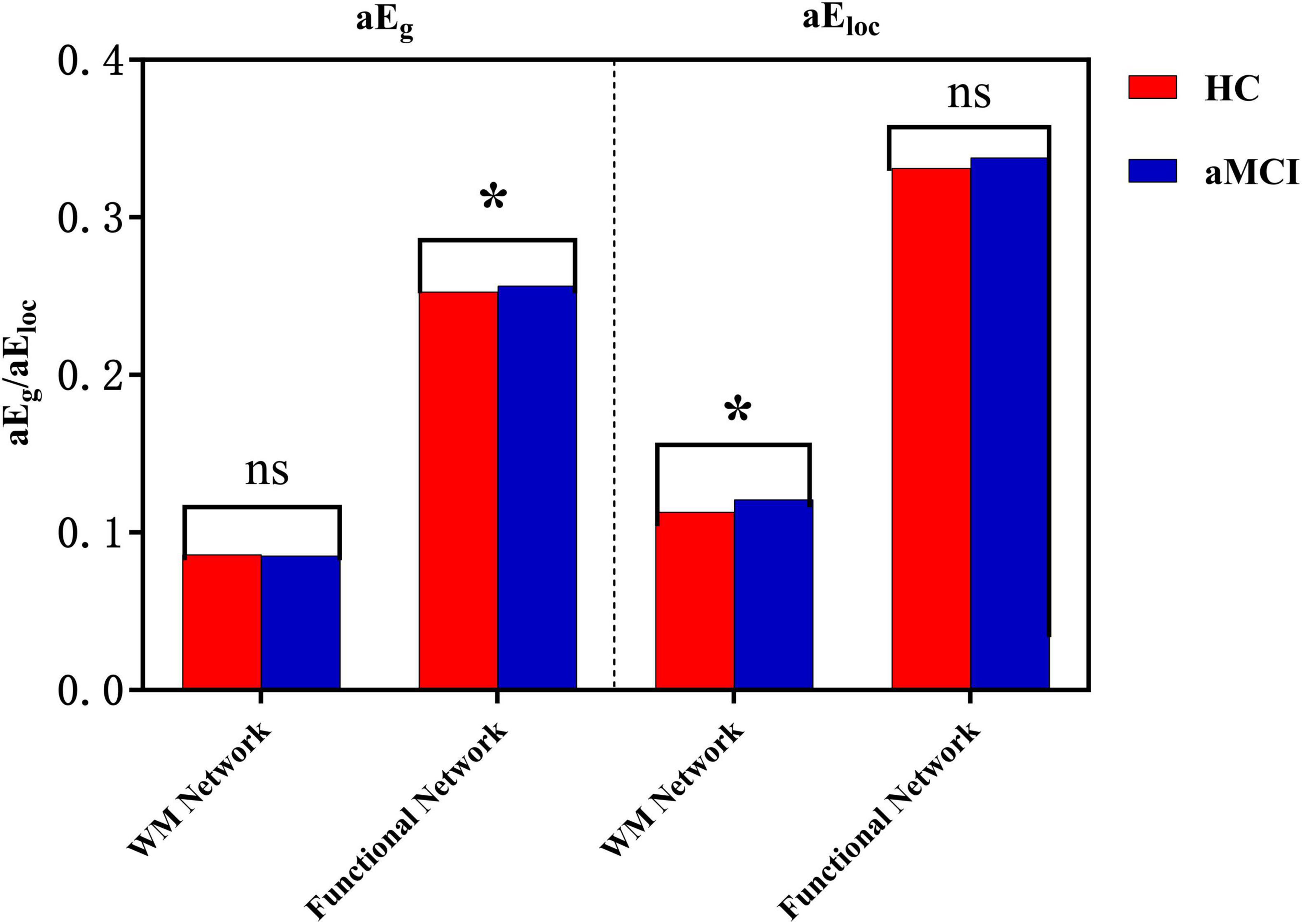 Figure 10. Intergroup comparison of aEg and aEloc. *Indicates statistical significance at P < 0.05 (independent-samples t-test); ns denotes non-significant results. Red, HC group; blue, aMCI group. Covariates including age, gender, education years, MMSE and MoCA scores were controlled where applicable.