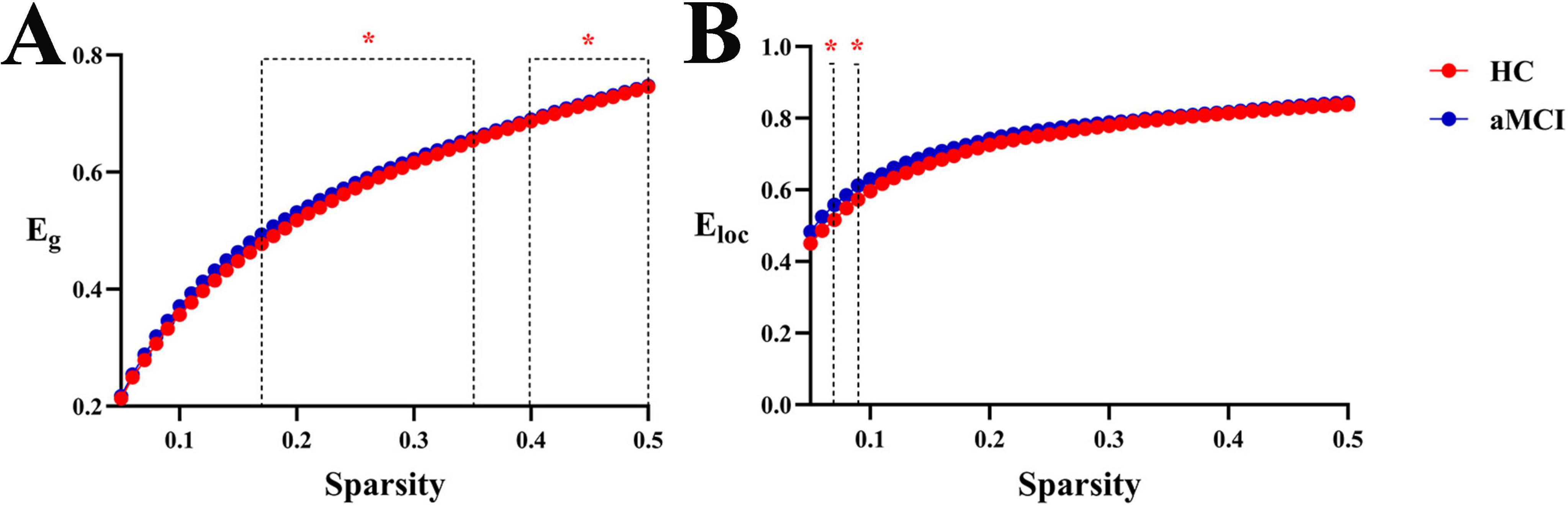 Figure 9. Trend graphs of intergroup comparison of network efficiency in WM structural networks across sparsity (0.21∼0.41). *Indicates P < 0.05 (statistically significant); (A) line graph of intergroup comparison of Eg across sparsity; (B) line graph of intergroup comparison of Eloc, across sparsity; Eg, global efficiency; Eloc, local efficiency.