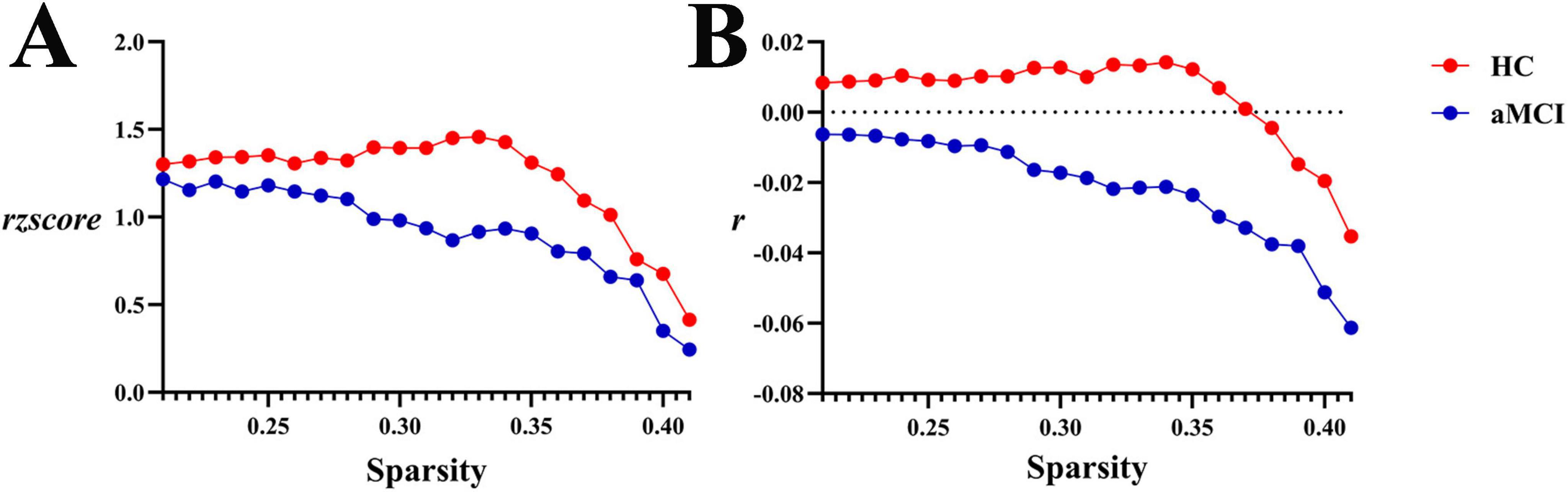 Within the sparsity range of 0.05∼0.5, there were no statistically significant differences in assortativity coefficients (r and rzscore) between the two groups (P > 0.05). However, in this range, both HC and aMCI groups showed r > 0, indicating an assortative structure in the entire functional network, as shown in Figures 13, 14.