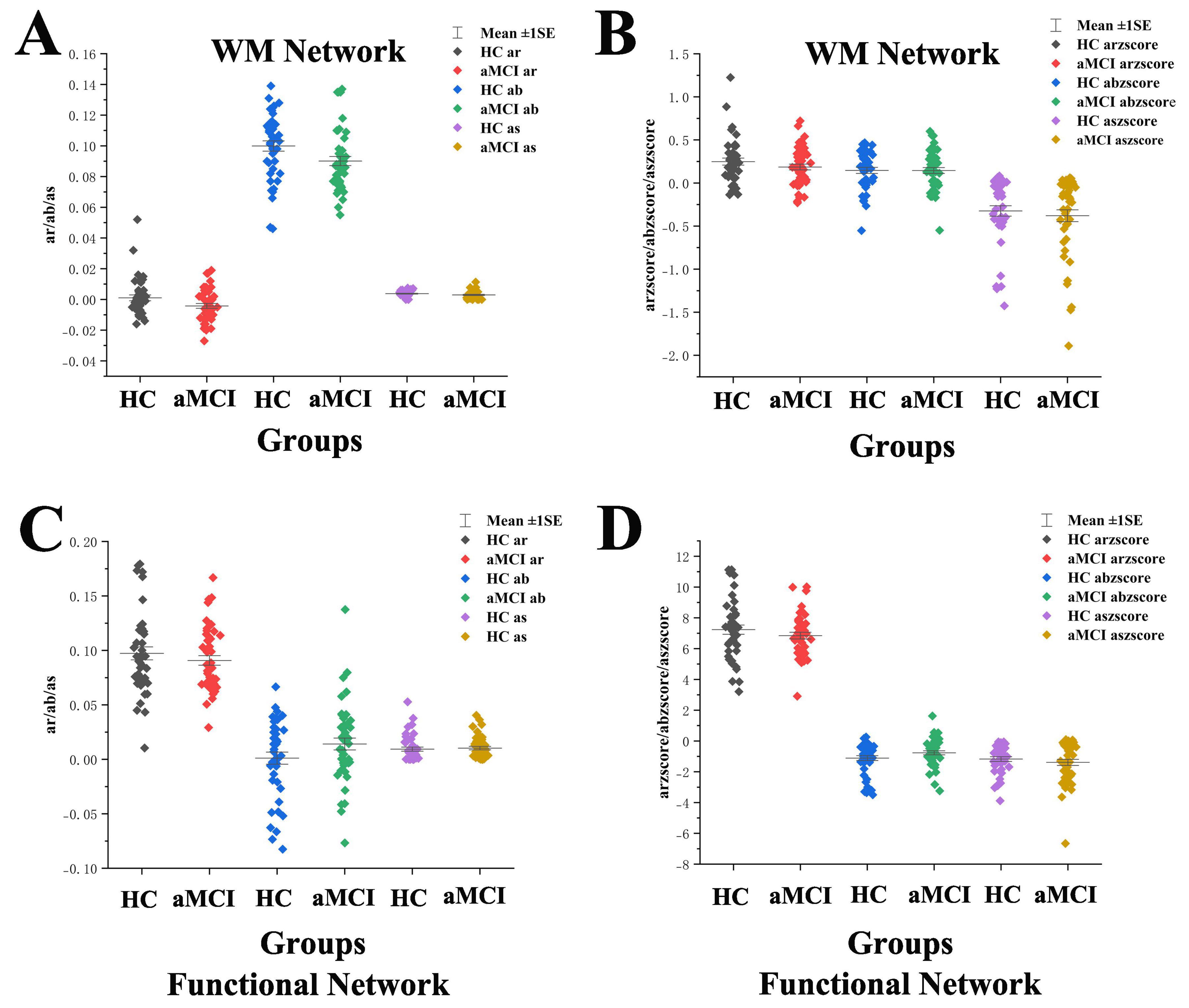 Figure 13. Intergroup comparison of assortativity, hierarchy and synchronization. (A) Intergroup comparison of ar, ab and as in WM network. (B) Intergroup comparison of arzcore, abzcore and aszcore in WM network. (C) Intergroup comparison of ar, ab and as in functional network. (D) Intergroup comparison of arzcore, abzcore and aszcore in functional network. Mean ± SE: Mean ± Standard Error.