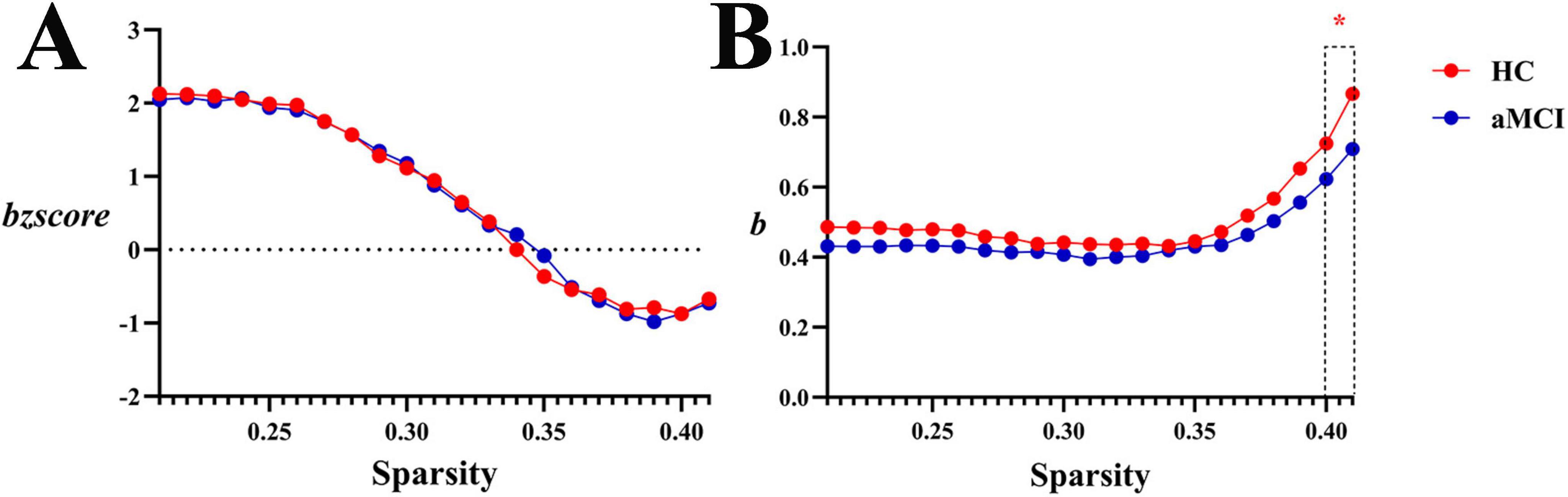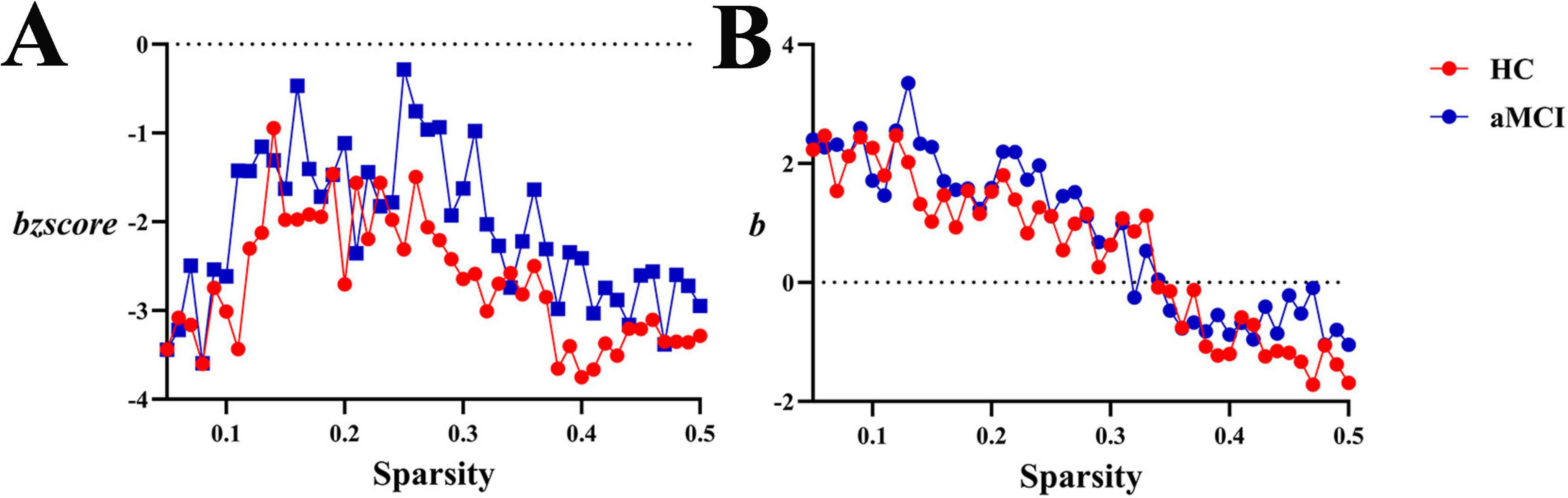 Network hierarchy analysis showed b > 0 in both HC and aMCI white matter structural networks (Figure 15), indicating enhanced hierarchy. The b remained stable at 0.5, indicating that the hierarchical organization of the HC group’s brain structural network was relatively steady. When sparsity increased beyond 0.38, b rose rapidly—this implies that the healthy brain network proactively strengthens its hierarchical structure as connections become sparser, which may serve as an “efficient simplification” strategy to preserve key hierarchical regulation. In contrast, the b value of the aMCI group was consistently lower than that of the HC group: it remained flatter at low sparsity, and although it also increased in the later stage, the magnitude of this increase was weaker than that in the HC group. This suggests that the hierarchical organization ability of the aMCI patients’ brain structural network is impaired. The disease state may disrupt the “proactivity” of hierarchical construction; even as connections are simplified, the aMCI brain cannot strengthen the hierarchy at the WM structural level as effectively as the healthy brain, reflecting a decline in network regulatory efficiency. Literature suggests that increased b values in healthy older adults reflect adaptive reorganization during brain aging—with age-related degradation of white matter myelination and axonal integrity (especially long-range connections), the brain optimizes information processing pathways through hierarchical structuring. Whether the hierarchical changes in aMCI patients are driven solely by aging or by combined disease-specific damage and compensation requires longitudinal data for further exploration. In conclusion, as sparsity increased, the structural network of the HC group could proactively strengthen its hierarchy. In contrast, the structural network of the aMCI group exhibited weak hierarchical construction and was prone to disorganization. Notably, the functional network of aMCI patients showed increased hierarchy, which is inferred to reflect compensatory hierarchical enhancement.