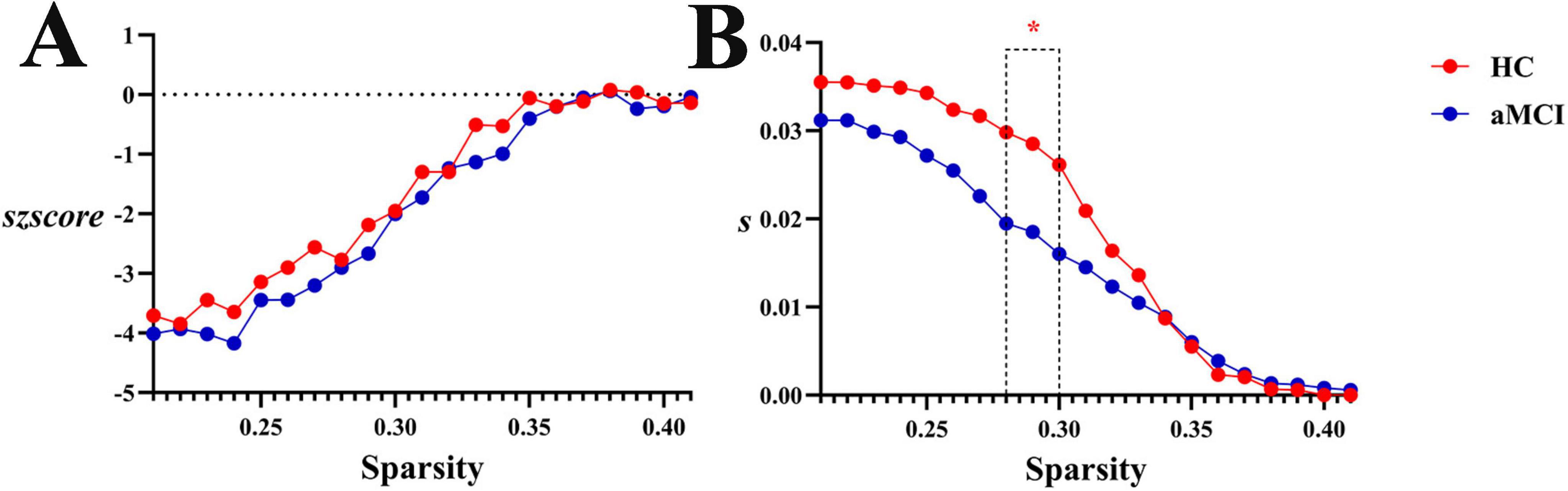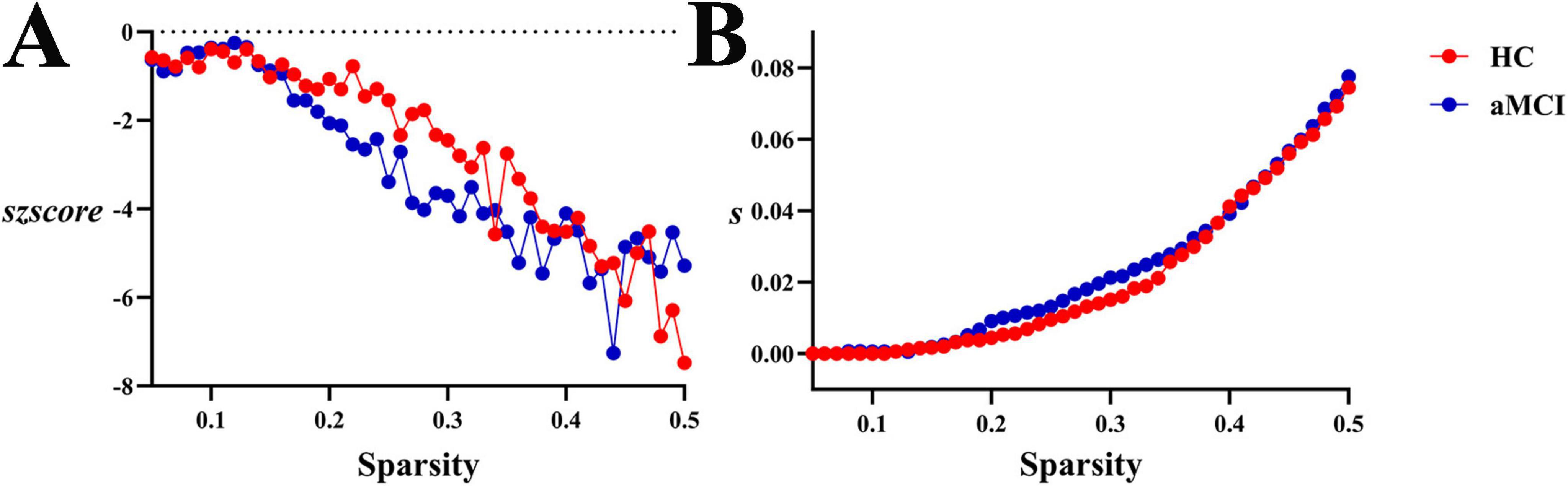 Synchronization analysis revealed critical evidence of functional impairment in aMCI brain networks: significantly decreased s values in white matter structural networks directly reflected reduced fiber connection density, indicating impaired functional synchrony. In the HC group, the s remained stably at a high level when sparsity ranged from 0.21 to 0.3. This indicates that the healthy WM network can maintain strong synchronization and efficient inter-regional collaboration when connections are relatively dense. As sparsity increased to 0.35–0.5, s decreased rapidly but still retained a certain degree of resilience. In contrast, the s value of the aMCI group was consistently lower than that of the HC group. This suggests that the synchronization of the WM network in aMCI patients is inherently weaker—once sparsity increases, the efficiency of inter-regional collaborative synchronization decreases. Meanwhile, analysis of the global synchronization strength of the functional network showed that as sparsity increased, functional synchronization in both the HC and aMCI groups increased continuously, though with tiny differences. Overall, the aMCI group exhibited stronger synchronization; however, this synchronization was more disorganized compared to that of random networks. This reflects the dual impairment of the functional network by the disease—specifically, impairment in both its ability to “streamline collaboration” and “enhance synchronization”. This finding aligns with Assortativity and hierarchy changes, outlining a pathological trajectory of “structural connection degradation—connection pattern remodeling—functional synchrony impairment” in aMCI patients. Future research could integrate multimodal data to deeply analyze the causal relationships among changes in different network properties, providing theoretical evidence for elucidating the pathogenesis of aMCI and developing targeted intervention strategies.
