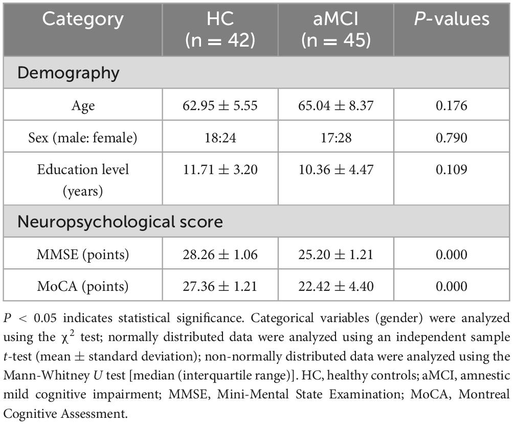 There were no significant statistical differences between the aMCI and HC groups in demographics (age, gender, years of education). However, there were significant statistical differences in neuropsychological scores (MMSE, MoCA) (P < 0.05). See Table 2 for details.