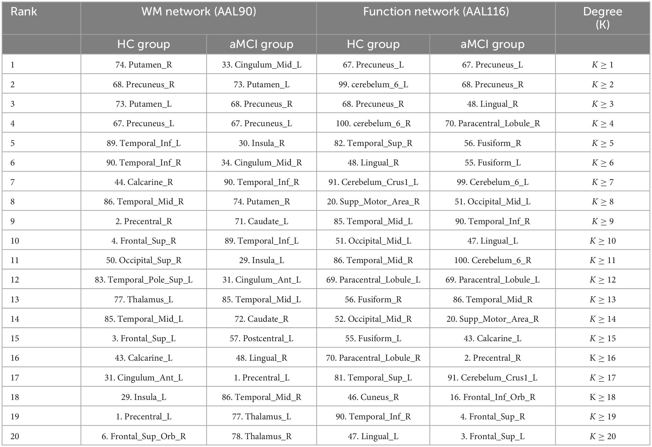 The top 20 nodes with the highest degree values in both groups were derived from the functional matrices, respectively. It was found that the degree-value nodes in the functional networks of the two groups also showed redistribution, yet the number of brain regions with changes was fewer than that in the white matter structural network (see Table 3). Additionally, significant differences in Rich-club connections were observed between the HC group and the aMCI group as shown in Figure 7.