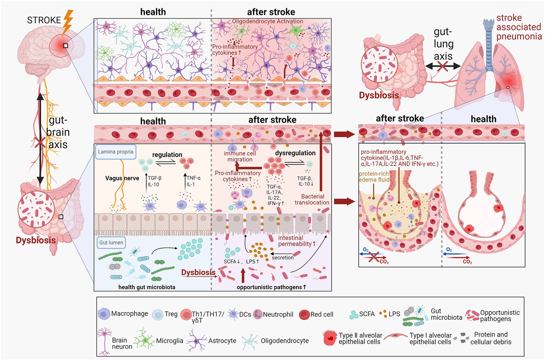 Post-stroke microbiome shifts alter metabolite levels, affecting SAP development via immune modulation and intestinal barrier integrity. Recent studies have shown that gut dysbiosis not only increases intestinal permeability and chronic inflammation but also contributes to inflammatory responses in the lungs.