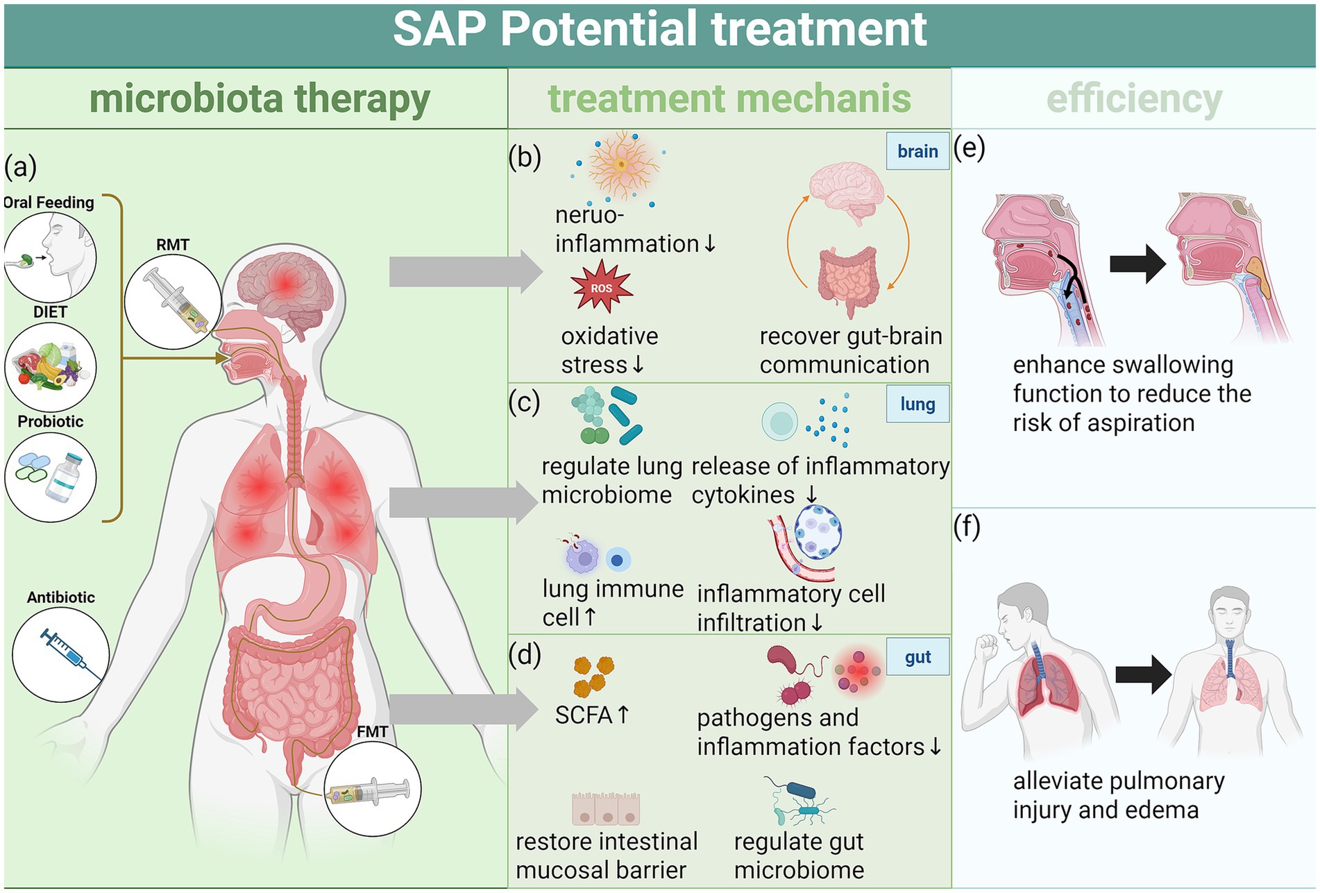 Figure 2. Microbiome therapy for SAP. (a) Current microbial therapies for SAP include dietary interventions, antibiotics, probiotics, FMT, and respiratory microbiota transplantation, administered via oral, intravenous, or endoscopic routes. (b) In the brain, microbial therapies can alleviate neuroinflammation and oxidative stress, thereby restoring gut–brain axis communication and improving gut microbial balance. (c) In the lungs, they help regulate the pulmonary microbiota, increase immune cell populations, promote the release of anti-inflammatory factors, reduce inflammatory cell infiltration, and lower pulmonary inflammation. (d) These therapies also promote SCFA production, repair the intestinal mucosal barrier, inhibit pathogenic bacteria, reduce pro-inflammatory cytokines, and modulate gut microbial composition, thereby suppressing intestinal inflammation, reducing the risk of intestinal leakage, and preventing bacterial translocation. (e,f) Overall, microbial therapies alleviate pulmonary inflammation and edema through multiple mechanisms, improve swallowing function, reduce the risk of aspiration, and effectively contribute to the treatment and prevention of SAP. Created with BioRender.com.
