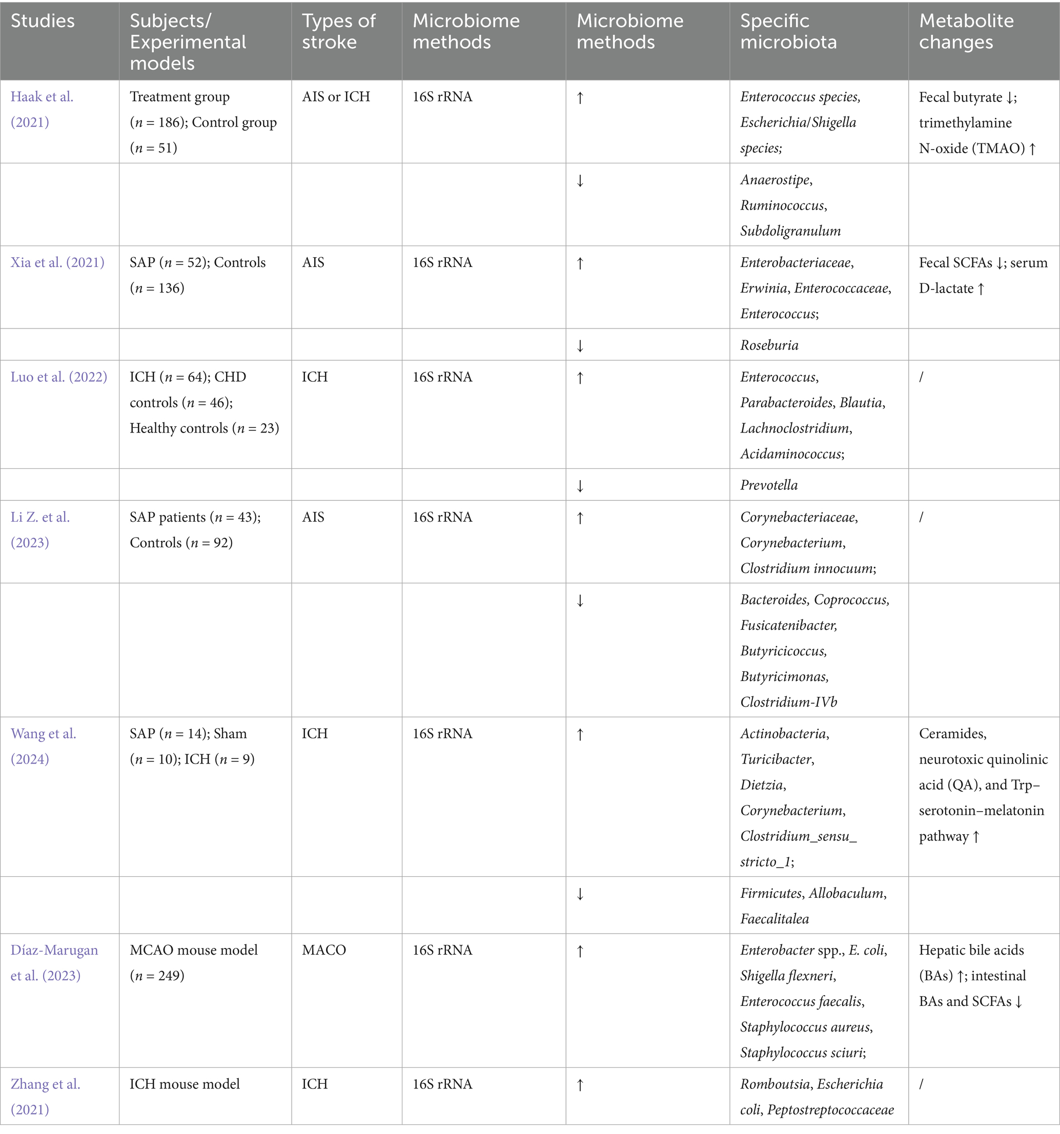 Preclinical animal studies have also reported similar patterns of gut microbiota dysbiosis after stroke. These include a rise in opportunistic or conditionally pathogenic bacteria and a decline in probiotic bacteria that produce SCFAs. For example, in a Klebsiella pneumoniae (KP)-induced SAP mouse model, analysis of fecal samples showed a reduction in Firmicutes and an increase in Actinobacteria at the phylum level. At the genus level, the abundance of beneficial bacteria, such as Allobaculum and Faecalitalea, was decreased, while opportunistic pathogens, including Turicibacter, Dietzia, Corynebacterium, and Clostridium sensu stricto 1,were abnormally increased (Wang et al., 2024). Similarly, studies using middle cerebral artery occlusion (MCAO) mouse models have reported related changes in gut microbiota. In these models, fecal analysis revealed increased abundance of Enterobacter spp., Escherichia coli, Shigella flexneri, Enterococcus faecalis, Staphylococcus aureus, and Staphylococcus sciuri (Díaz-Marugan et al., 2023). However, inhibition of Enterobacteriaceae overgrowth in the gut did not prevent their colonization in the lungs after stroke, suggesting that other mechanisms, such as aspiration, may also contribute to the development of SAP. In another study using an ICH model, the lung microbiota on day 7 after stroke resembled the gut microbiota. The relative abundance of bacteria, including Lactobacillus, Candidatus Arthromitus, and Escherichia coli, was increased in both lung and intestinal tissues. These findings indicate that post-stroke pulmonary infections are associated with gut microbiota dysbiosis, which aligns with clinical observations (Zhang et al., 2021).