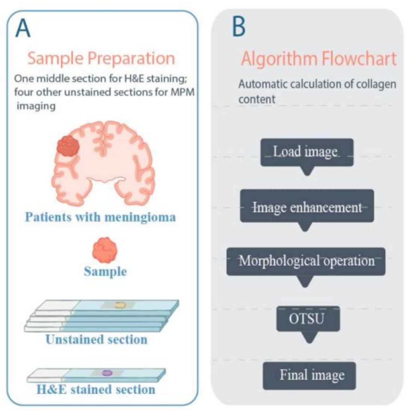 As shown in Figure 1A, each specimen was sectioned into five serial cryostat sections. Sections 1, 2, 4, and 5, each approximately 20 μm thick, were used for MPM imaging. Section 3, with a thickness of 4–6 μm, was stained with hematoxylin and eosin (H&E) to obtain histological images and for comparative validation of the MPM imaging results. During MPM imaging, the fresh cryosections were mounted between a cover slip and a microscope slide and perfused with phosphate-buffered saline (PBS) solution to prevent dehydration or shrinkage. The pathological diagnosis of fibrous meningiomas was independently confirmed by two professional neuropathologists, using both H&E images for pathology diagnosis and MPM images for a blind test.