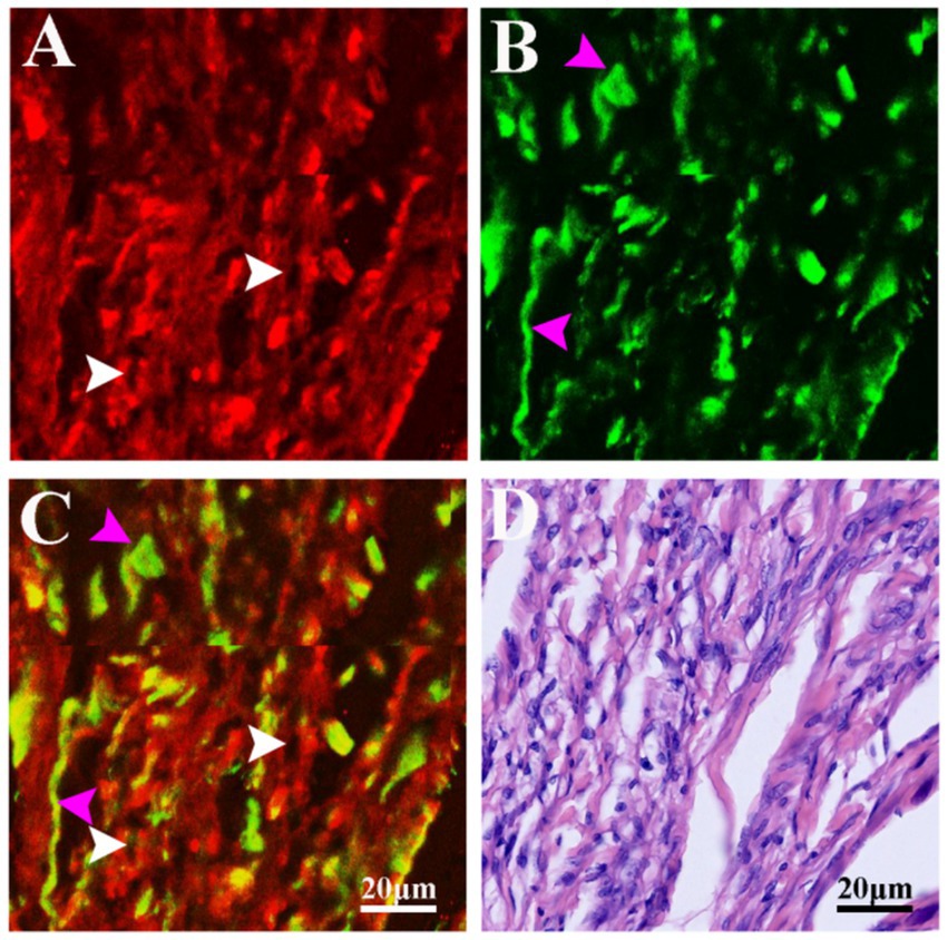 Figure 3. The magnified TPEF, SHG, TPEF/SHG overlaid and corresponding H&E images of the selected area (yellow line box) in Fig. S3C. (A) Magnified TPEF image; (B) magnified SHG image; (C) magnified TPEF/SHG overlaid images; (D) corresponding H&E stained images. White arrows: cells; purple arrows: collagen fiber.