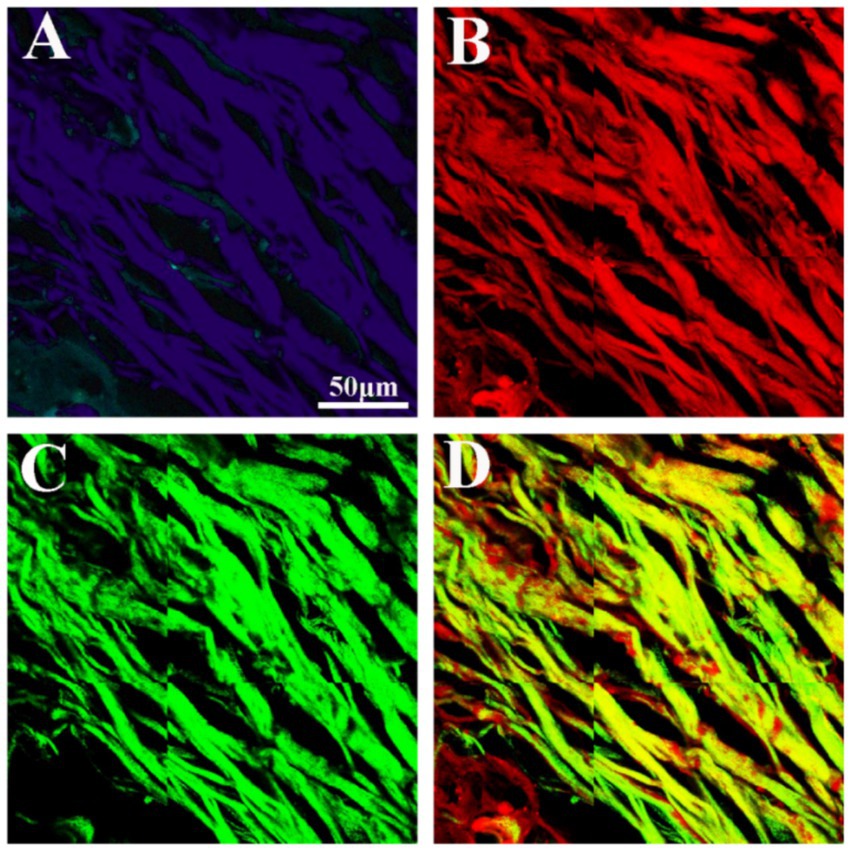 Figure 6. Image analysis of collagen fiber in fibrous meningioma using the 32 channels combined spectral image. (A) Original the 32 channels combined spectral image; (B) image after image enhancement processing; (C) image after morphological processing; (D) final image analysis results.