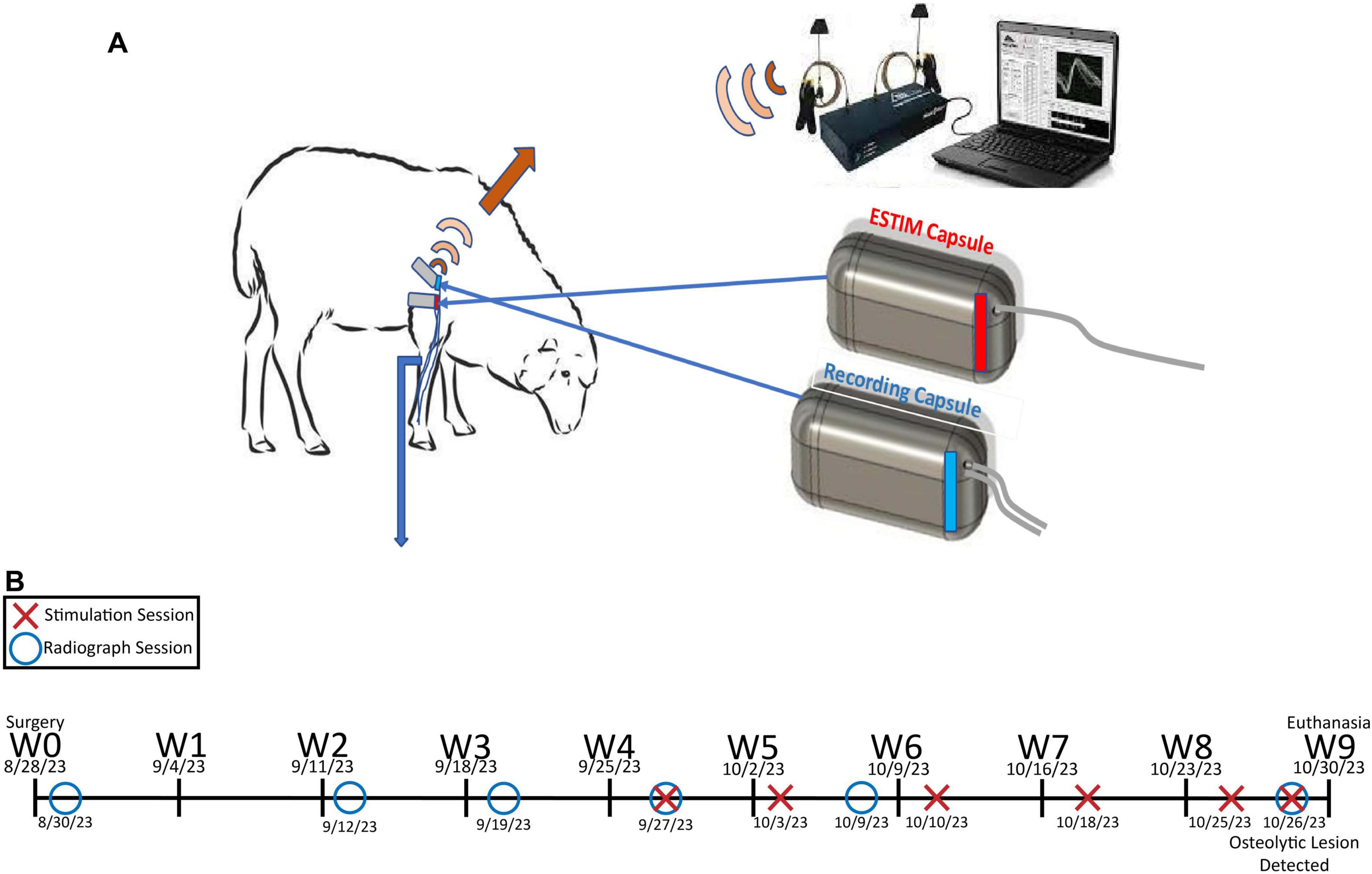 Figure 1. (A) Depiction of the general experimental paradigm employed in this study. (B) Experimental timeline for Sheep A from week 0 (W0) to week 9 (W9).