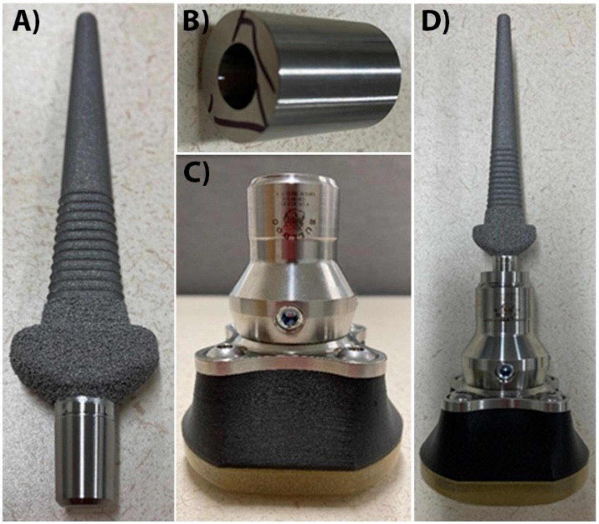 Figure 2. Endo- and exo-prosthetic componentry. The endoprosthetic implant (A) is inserted into the medullary canal of the metacarpal bone. The Morse Taper cylinder adapter (B) attaches to the percutaneous, smooth portion of the endoprosthesis. The exoprosthetic hoof (C) attaches to the cylinder portion of the Morse Taper adapter. The entire endo- and exo- prosthetic construct is shown in (D). Not to scale.
