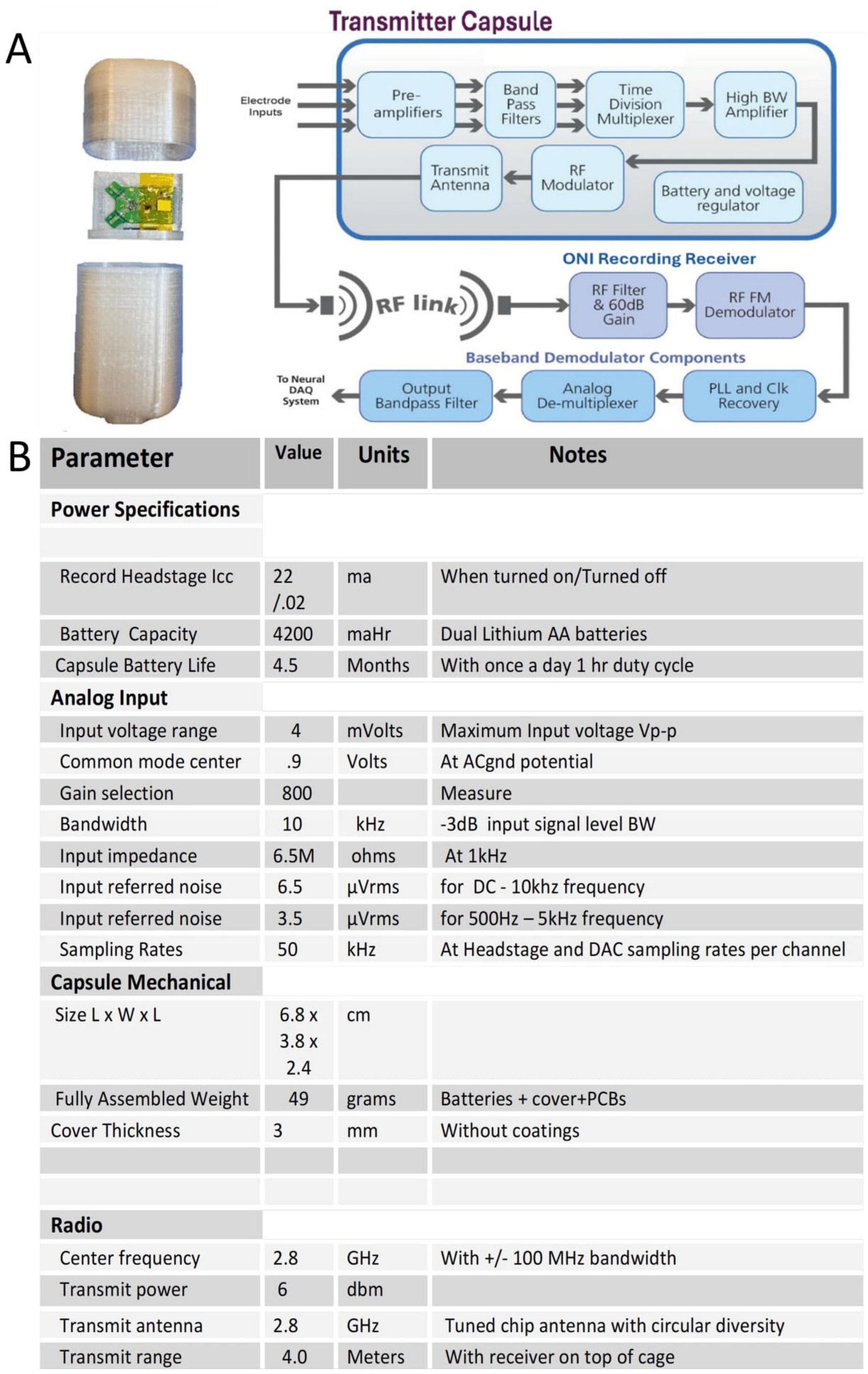 Figure 3. (A) Open capsule and system block diagram of the recording transmitter capsule. (B) Specification table for the recording capsule.