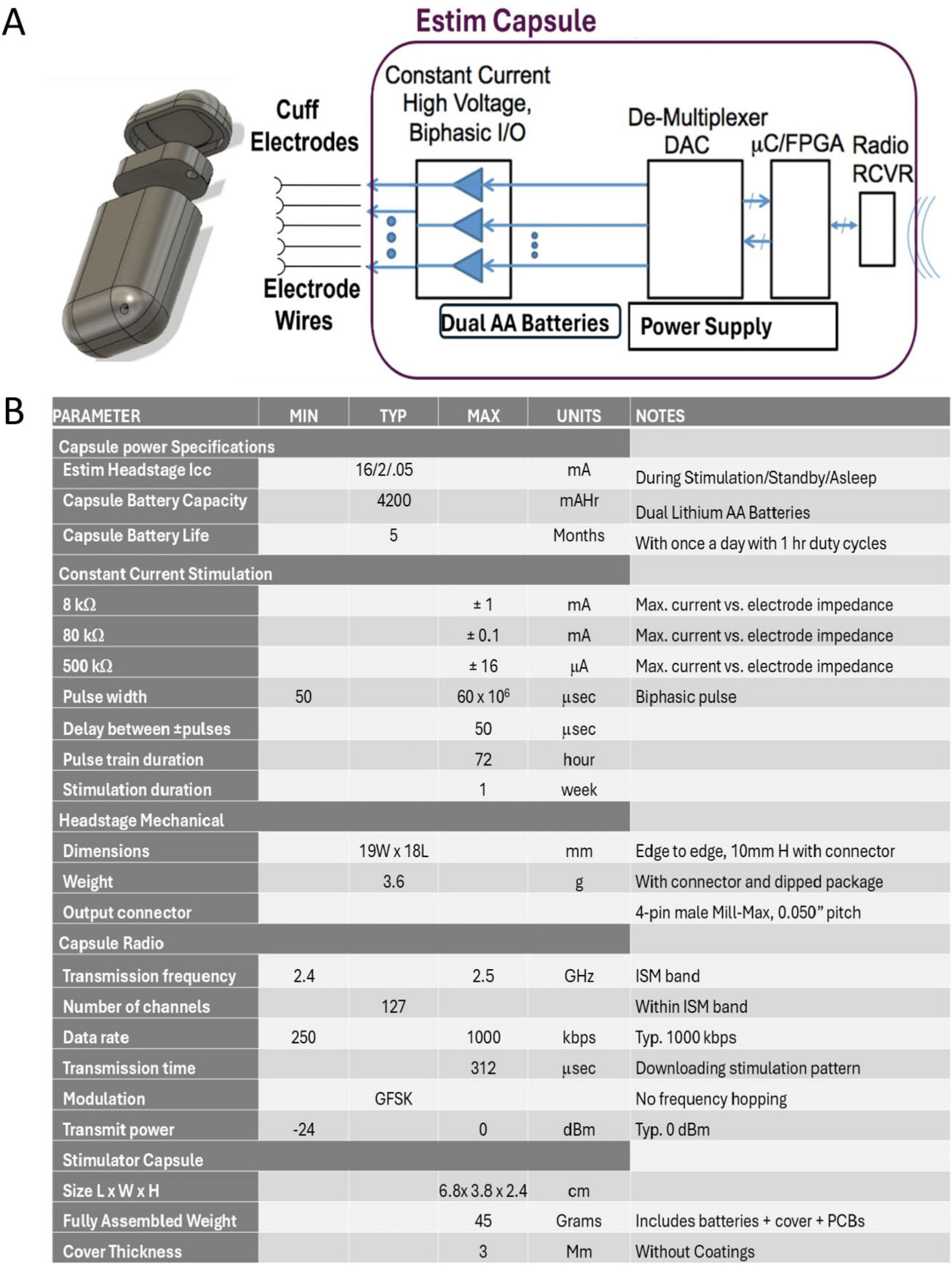 Figure 4. (A) 3D drawing and system block diagram of the Estim capsule. (B) Specification table for the Estim Capsule.