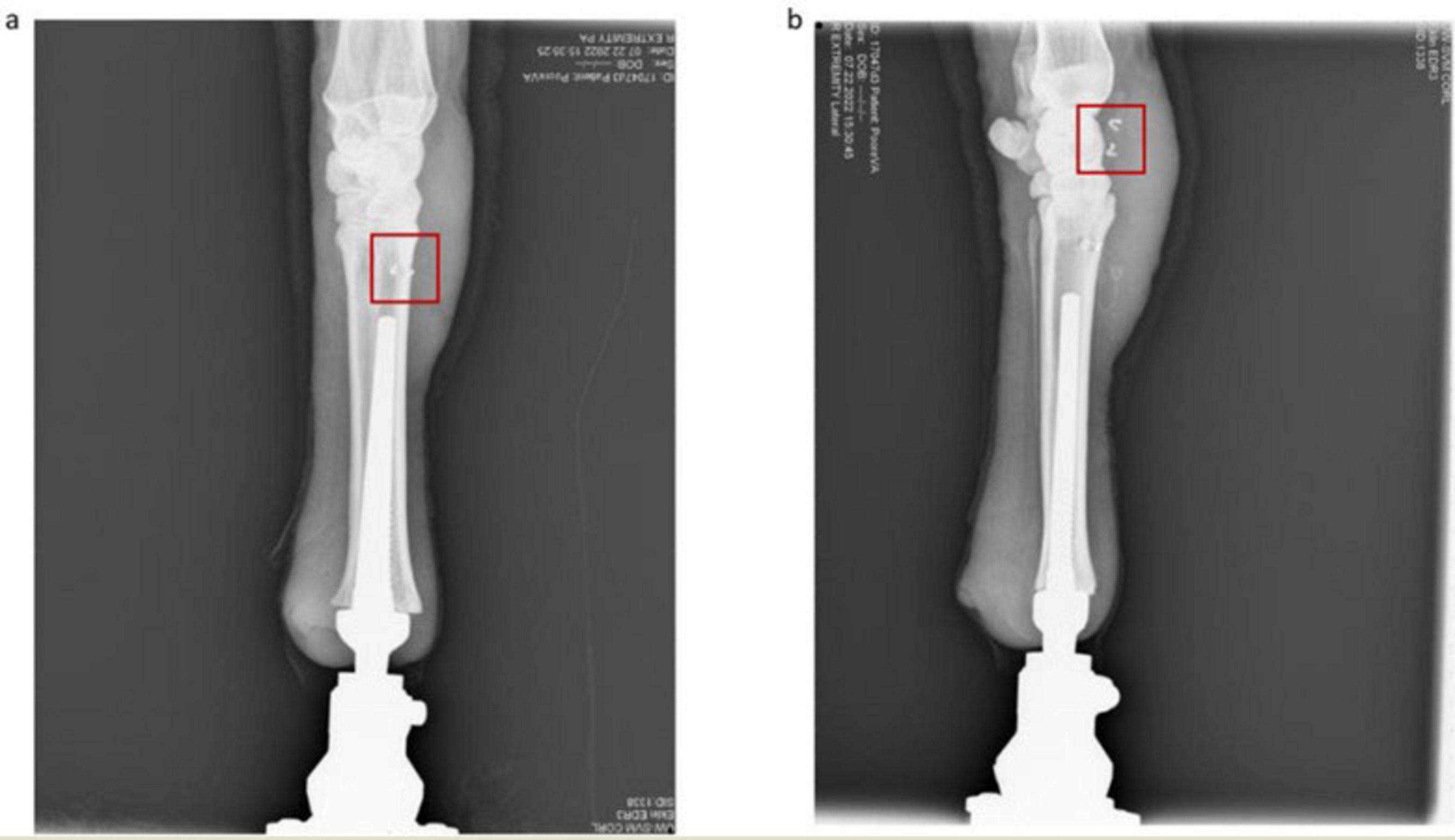 Figure 5. (a) Anterior view of osseointegrated ovine thoracic limb for Sheep A. The osseointegrated implant is nested within the reamed medullary canal and the intramedullary electrodes are outlined in red. (b) Lateral view of osseointegrated ovine thoracic limb. The recording electrodes proximal to the corticotomy are outlined in red.