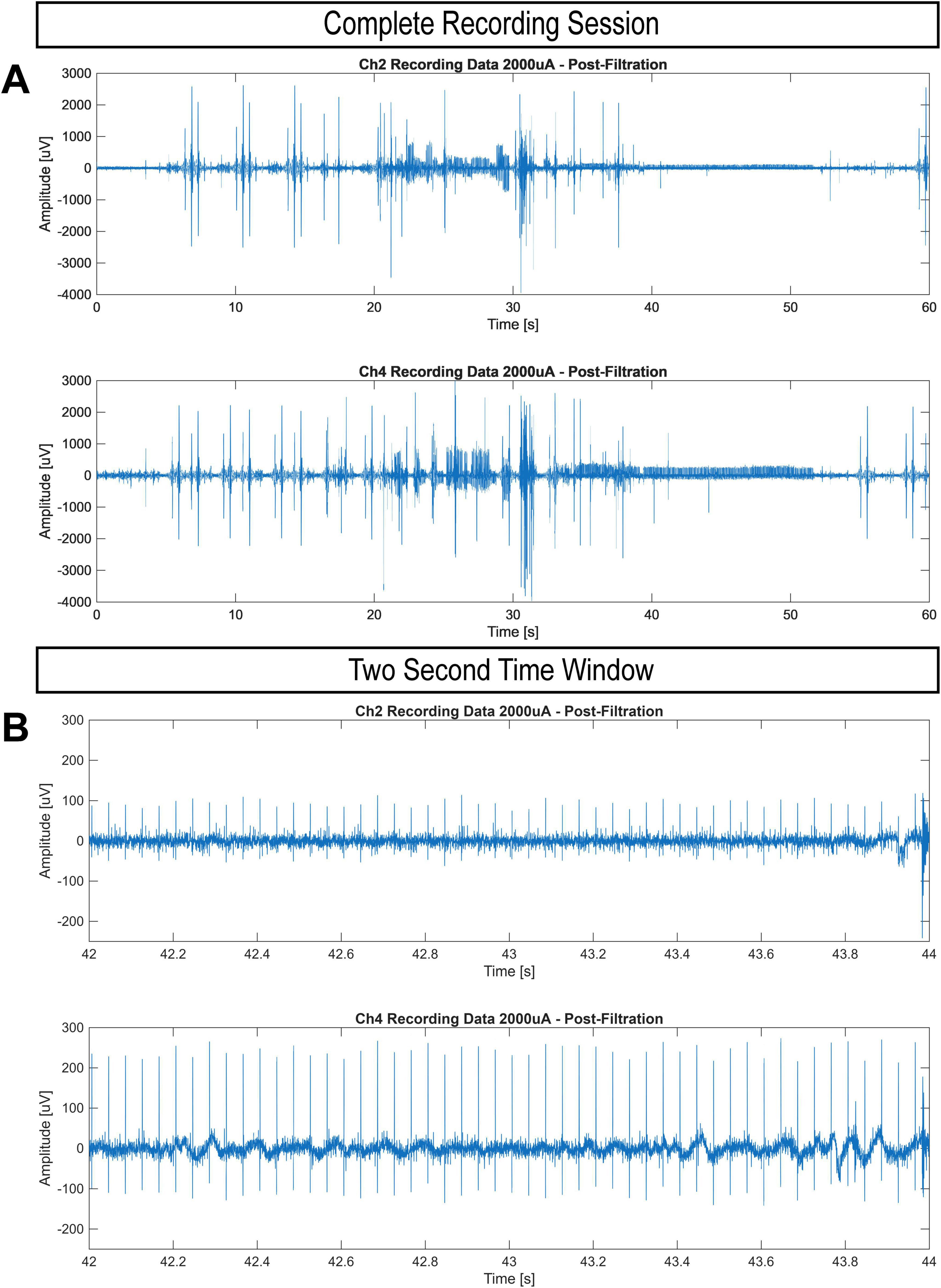Figure 6. Dual-Channel recordings of a stimulation session delivering 2,000 μA at 25 Hz for 30 s (20–50 s) approximately four weeks post-surgery. Channel 2 represents the extra-medullary recording electrode while Channel 4 represents the intra-medullary recording electrode. All data underwent filtration pipeline detailed in the methods section. (A) Complete 60 s recording window. (B) Two second time window which illustrates the difference in signal strength between the two electrodes.
