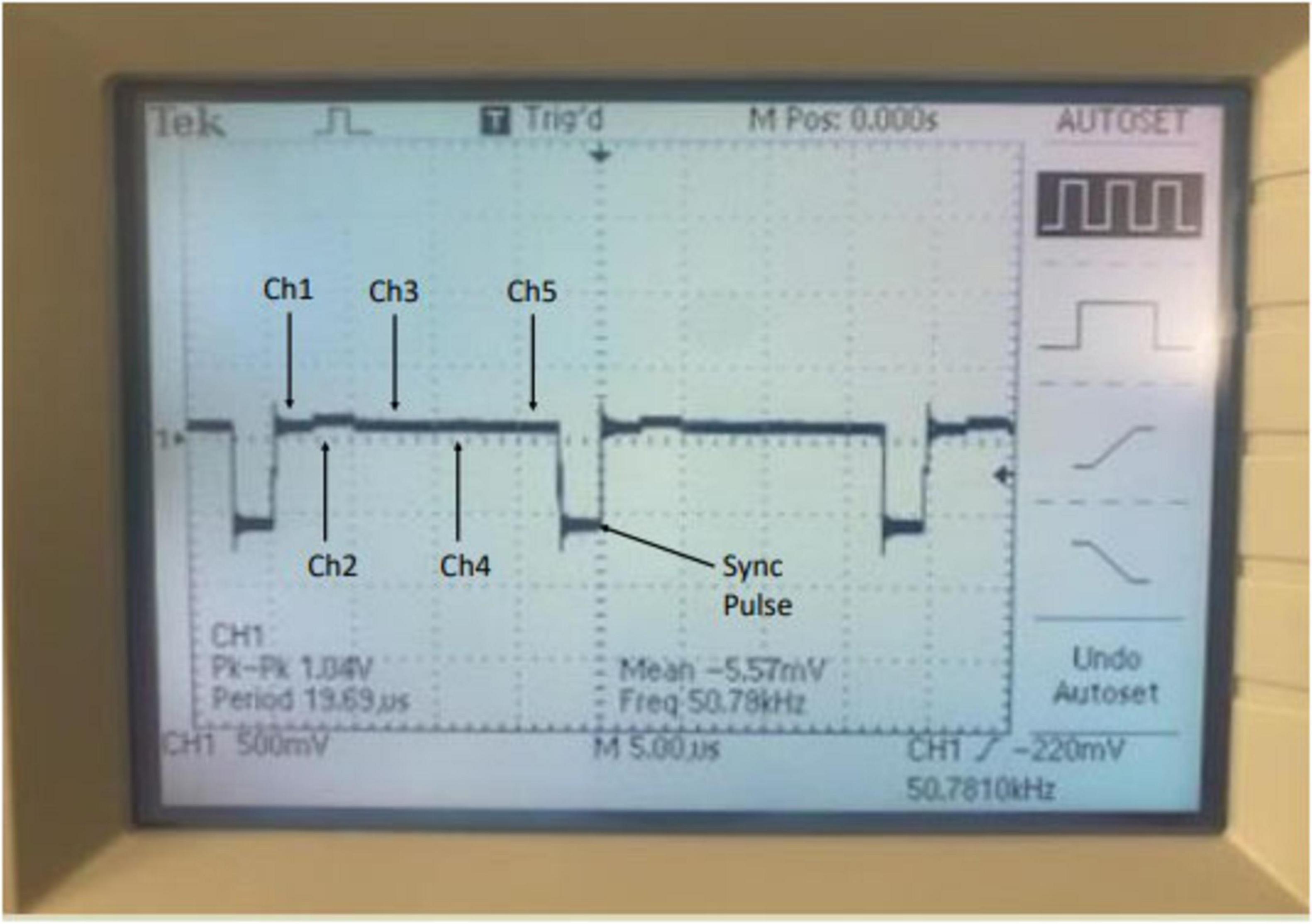 Figure 7. Oscilloscope reading of the receiver sync pulse taken at 8 weeks demonstrating the recording capsule is functional and successfully communicating with the receiver box. Time division multiplexing enables transmission of data from all 5 Channels at 50 k Hz sampling per channel of the recording implant through one multiplexed output signal. Information from each channel is split sequentially between the sync pulse.
