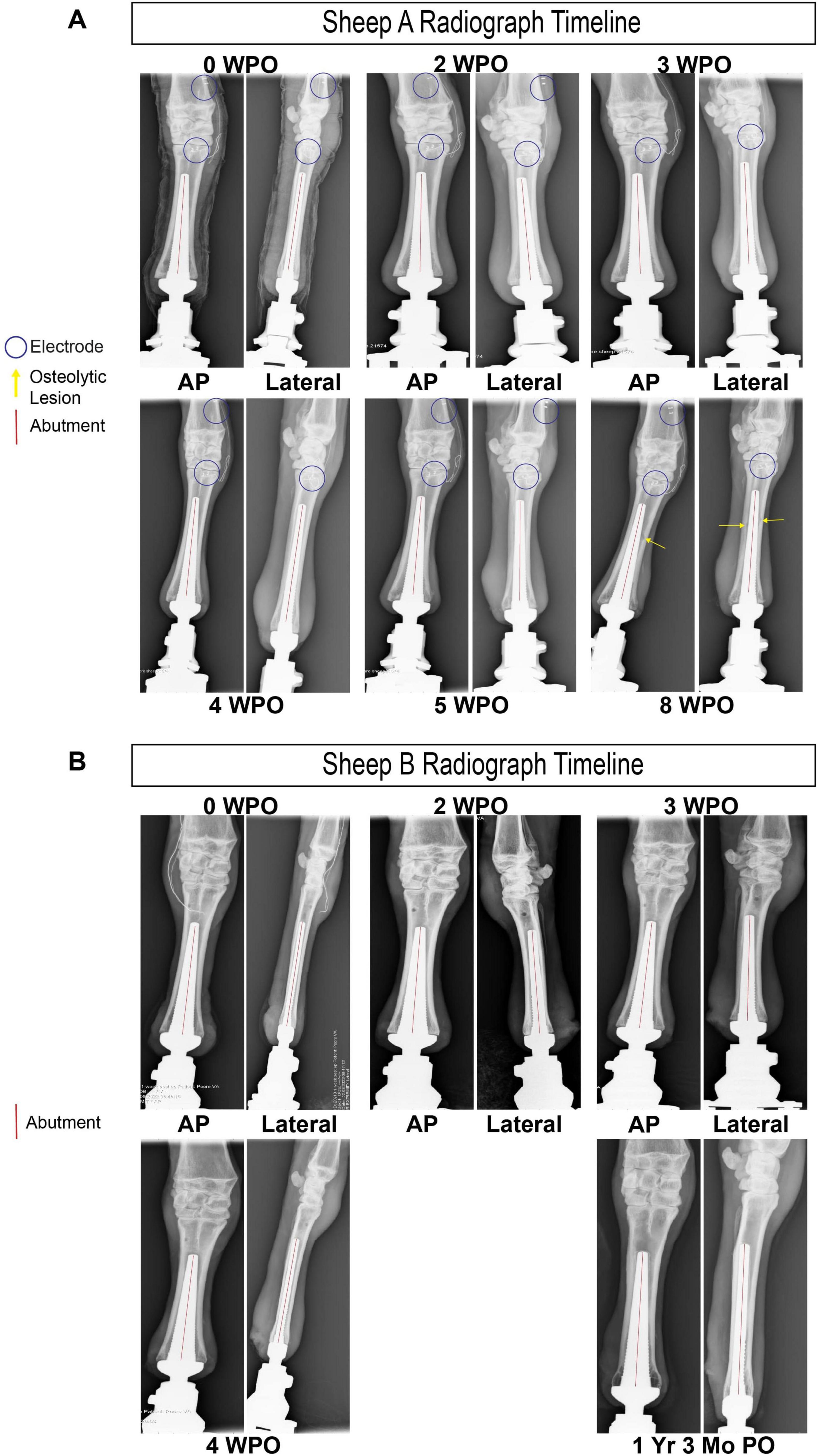 Figure 8. (A) Radiological imaging of Sheep A from 0 weeks post-op (WPO) to 8 WPO (B) radiological imaging of Sheep B from 0 WPO to 1 year and 3 months post-op.