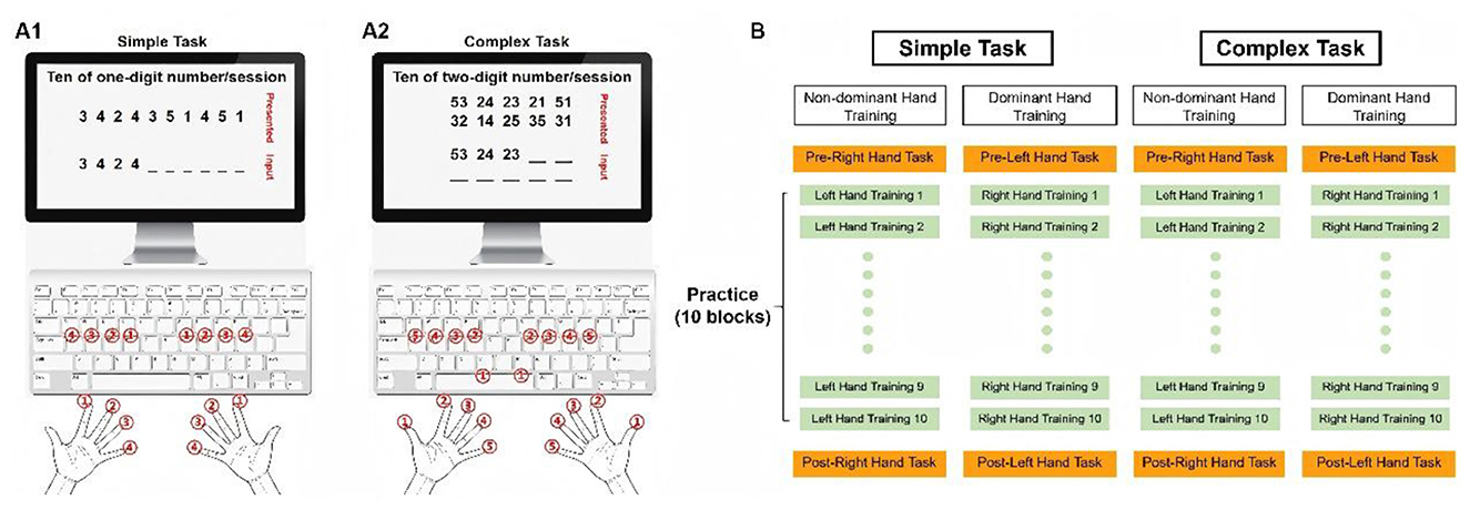 Consistent with our previous study (Wang et al., 2022), participants performed a one-digit movement task (Figure 1A1) and a two-digit movement task (Figure 1A2) using either their dominant or non-dominant hand. They were instructed to press designated keys with specific fingers corresponding to the numbers displayed on the screen. For the simple one-digit task, participants used four fingers (excluding the thumb), each mapped to a specific digit (index finger: 1, middle finger: 2, ring finger: 3, little finger: 4; Figure 1A1). For the complex two-digit task, all five fingers were used (thumb: 1, index finger: 2, middle finger: 3, ring finger: 4, little finger: 5), requiring sequential key presses with two fingers for each digit pair (Figure 1A2). Each session comprised 10 randomly presented one-digit or two-digit numbers presented without repetition, followed by a 3 sec intermission. Incorrect inputs were highlighted in red and could not be corrected.