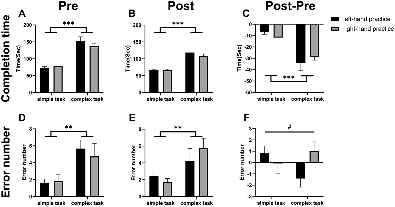 Figure 2. Motor skill acquisition. Results of two-way ANOVA. (A) indicates during the pre-test, the completion time was significantly longer in the complex conditions (CL, CR) than in the simple conditions (SL, SR). (B) Shows during the post-test, the completion time was significantly longer in the complex conditions than in the simple conditions. (C) demonstrates the difference in completion time (post-test minus pre-test) was significantly greater in the complex conditions than in the simple conditions, indicating a significantly larger improvement in the complex conditions. (D) reveals during the pre-test, the error number was significantly higher in the complex conditions than in the simple conditions. (E) indicates during the post-test, the error number was significantly higher in the complex groups than in the simple conditions. (F) shows the difference in error number (post-test minus pre-test) did not differ significantly between the simple and complex conditions. But a significant interaction effect of “Task complexity” × “Hand” was detected (#p < 0.05). Asterisks denote main effect significant differences: *p < 0.05, **p < 0.01, ***p < 0.001.