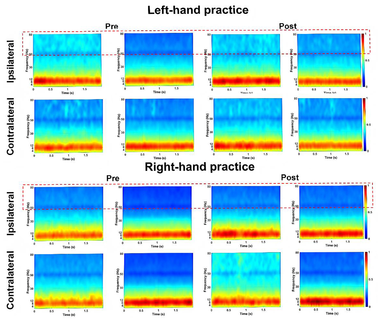 Figure 3. PSD Patterns of each group for ipsilateral vs. contralateral M1 activation during left- and right-hand practice. Illustrating the PSD of ipsilateral and contralateral M1 activation during simple and complex task trials in pre-test and post-test sessions. Results are shown for left-hand practice (top panel) and right-hand practice (bottom panel). The vertical axis represents frequency (0–80 Hz), and the horizontal axis represents time (0–2s). The color bar (range: 0–1) indicates PSD magnitude, with warmer colors (red) denoting higher power values and cooler colors (blue) denoting lower power values. Intermediate values are shown in green. The red dashed box contains the PSD in the range of 50-80 Hz. The image was generated using MATLAB 2021b.