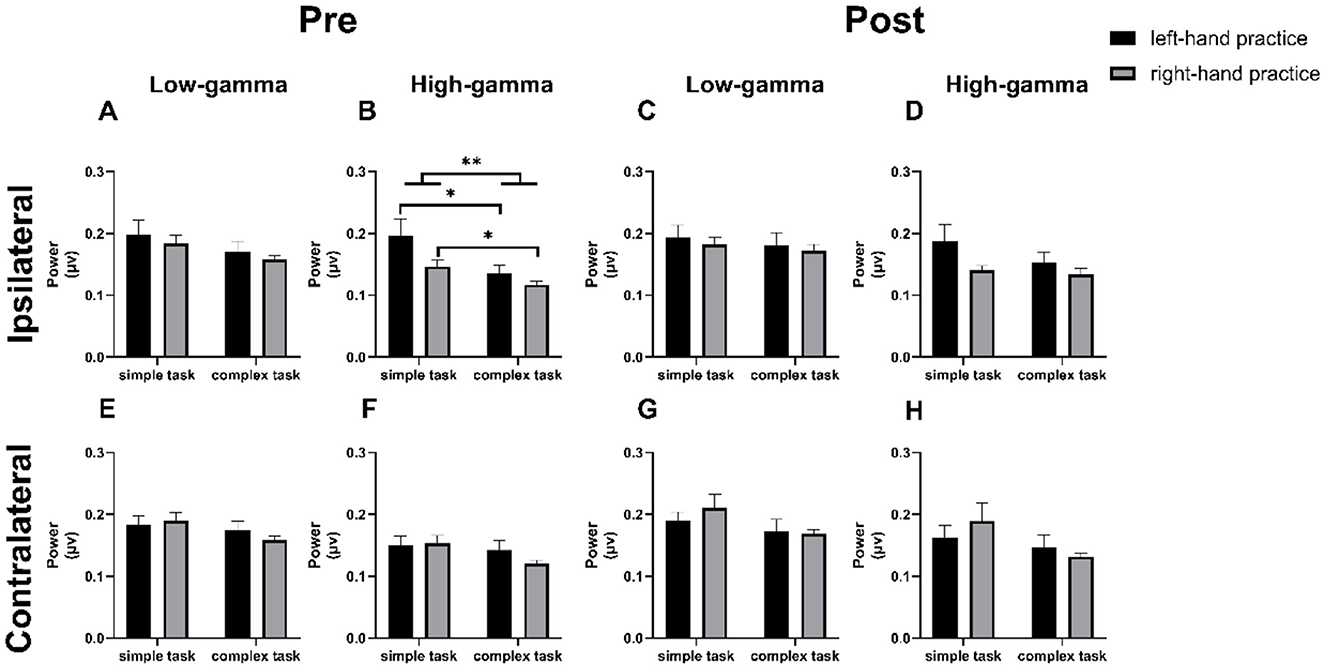 No significant main effects or interaction effects were detected in the low-gamma band (Figure 4A, two-way ANOVA, main effect of “Task complexity”, F (1, 43) = 3.031, p = 0.089, η2 = 0.066; main effect of “Hand”, F (1, 43) = 0.852, p = 0.361, η2 = 0.019; interaction of “Task complexity” x “Hand”, F (1, 43) = 0.036, p = 0.970, η2 = 0.007), over the cM1 (Figures 4E, F, two-way ANOVA, main effect of “Task complexity”, low-gamma: F (1, 43) = 2.320, p = 0.135, η2 = 0.051; high-gamma: F (1, 43) = 2.514, p = 0.120, η2 = 0.055, main effect of “Hand”, low-gamma: F (1, 43) = 0.105, p = 0.747, η2 = 0.002; high-gamma: F (1, 43) = 0.480 p = 0.492, η2 = 0.011, interaction of “Task complexity” x “Hand”, low-gamma: F (1, 43) = 0.723, p = 0.400, η2 = 0.017; high-gamma: F (1, 43) = 1.042, p = 0.313, η2 = 0.024), or in any frequency band of the ipsilateral or contralateral M1 during post-training (Figures 4C, D, G, H, two-way ANOVA, main effect of “Task complexity”, iM1 in low-gamma: F (1, 43) = 0.502, p = 0.482, η2 = 0.012; iM1 in high-gamma: F (1, 43) = 1.512, p = 0.226, η2 = 0.034; cM1 in low-gamma: F (1, 43) = 3.175, p = 0.082, η2 = 0.069; cM1 in high-gamma: F (1, 43) = 3.152, p = 0.083, η2 = 0.068, main effect of “Hand”, iM1 in low-gamma: F (1, 43) = 0.414, p = 0.523, η2 = 0.010; iM1 in high-gamma: F (1, 43) = 3.537, p = 0.067, η2 = 0.076; cM1 in low-gamma: F (1, 43) = 0.252, p = 0.618, η2 = 0.006; cM1 in high-gamma: F (1, 43) = 0.071, p = 0.792, η2 = 0.002, interaction of “Task complexity” x “Hand”, iM1 in low-gamma: F (1, 43) = 0.004, p = 0.949, η2 = 0.002; iM1 in high-gamma: F (1, 43) = 0.641, p = 0.428, η2 = 0.015; cM1 in low-gamma: F (1, 43) = 0.610, p = 0.439, η2 = 0.014; cM1 in high-gamma: F (1, 43) = 1.066, p = 0.308, η2 = 0.024).