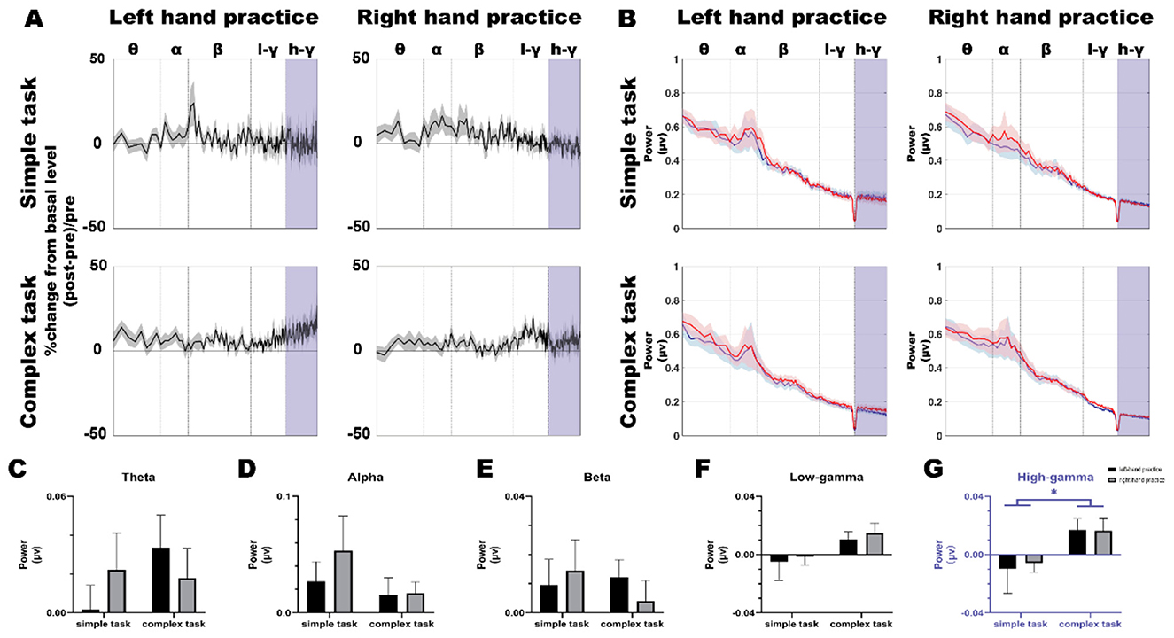 Finally, analysis revealed distinct patterns in iM1 activation between pre- and post-test (Figures 5A, B). Notably, the complex condition showed a significant increase in high-gamma band activity (Figure 5G, two-way ANOVA, main effect of “Task complexity”, F (1, 43) = 5.530, p = 0.023, η2 = 0.114; main effect of “Hand”, F (1, 43) = 0.025, p = 0.875, η2 = 0.001; interaction of “Task complexity” x “Hand”, F (1, 43) = 0.047, p = 0.830, η2 = 0.001). No significant changes were observed in other frequency bands (Figures 5C–F, two-way ANOVA, main effect of “Task complexity”, theta: F (1, 43) = 0.712, p = 0.403, η2 = 0.016; alpha: F (1, 43) = 1.512, p = 0.226, η2 = 0.034; beta: F (1, 43) = 0.224, p = 0.638, η2 = 0.005; low-gamma: F (1, 43) = 3.890, p = 0.055, η2 = 0.083, main effect of “Hand”, theta: F (1, 43) = 0.024, p = 0.878, η2 = 0.001; alpha: F (1, 43) = 0.502, p = 0.482, η2 = 0.012; beta: F (1, 43) = 0.036, p = 0.851, η2 = 0.001; low-gamma: F (1, 43) = 0.268, p = 0.607, η2 = 0.006, interaction of “Task complexity” x “Hand”, theta: F (1, 43) = 1.259, p = 0.268, η2 = 0.028; alpha: F (1, 43) = 0.407, p = 0.527, η2 = 0.009; beta: F (1, 43) = 0.633, p = 0.431, η2 = 0.015; low-gamma: F (1, 43) = 0.003, p = 0.958, η2 = 0.001).