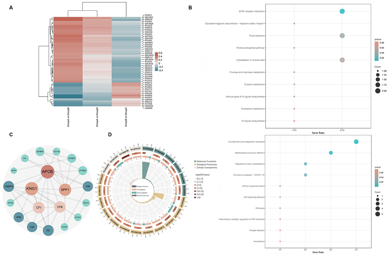 Figure 1. Bioinformatic analysis of differentially expressed proteins in CSF. (A) Heatmap of differentially expressed proteins in PDD vs. PD (Fold change >1.2, Q-value < 0.05). (B) Top 10 enriched KEGG pathways for upregulated and downregulated differentially expressed proteins. (C) Protein-protein interaction (PPI) network of differentially expressed proteins. (D) Gene Ontology (GO) functional annotation of differentially expressed proteins.