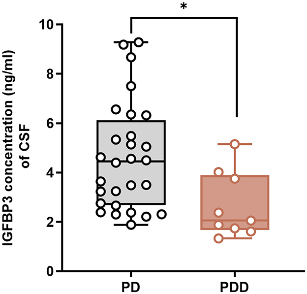 PDD patients exhibit decreased CSF IGFBP3 level compared to PD patients